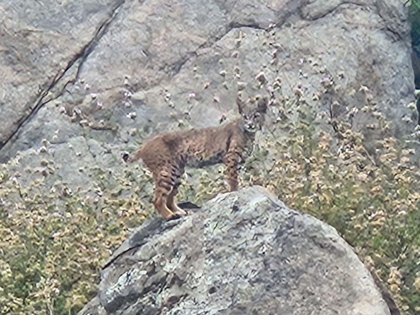 Another time I was fishing about 50' off the shore between Pig's and the dock. I looked at the shore and saw a heron. A few minutes later a coyote. And a few minutes later a juvenile mountain lion (definitely not a bobcat). As soon as it saw me, it started moving away so I got a picture but not a very good one.