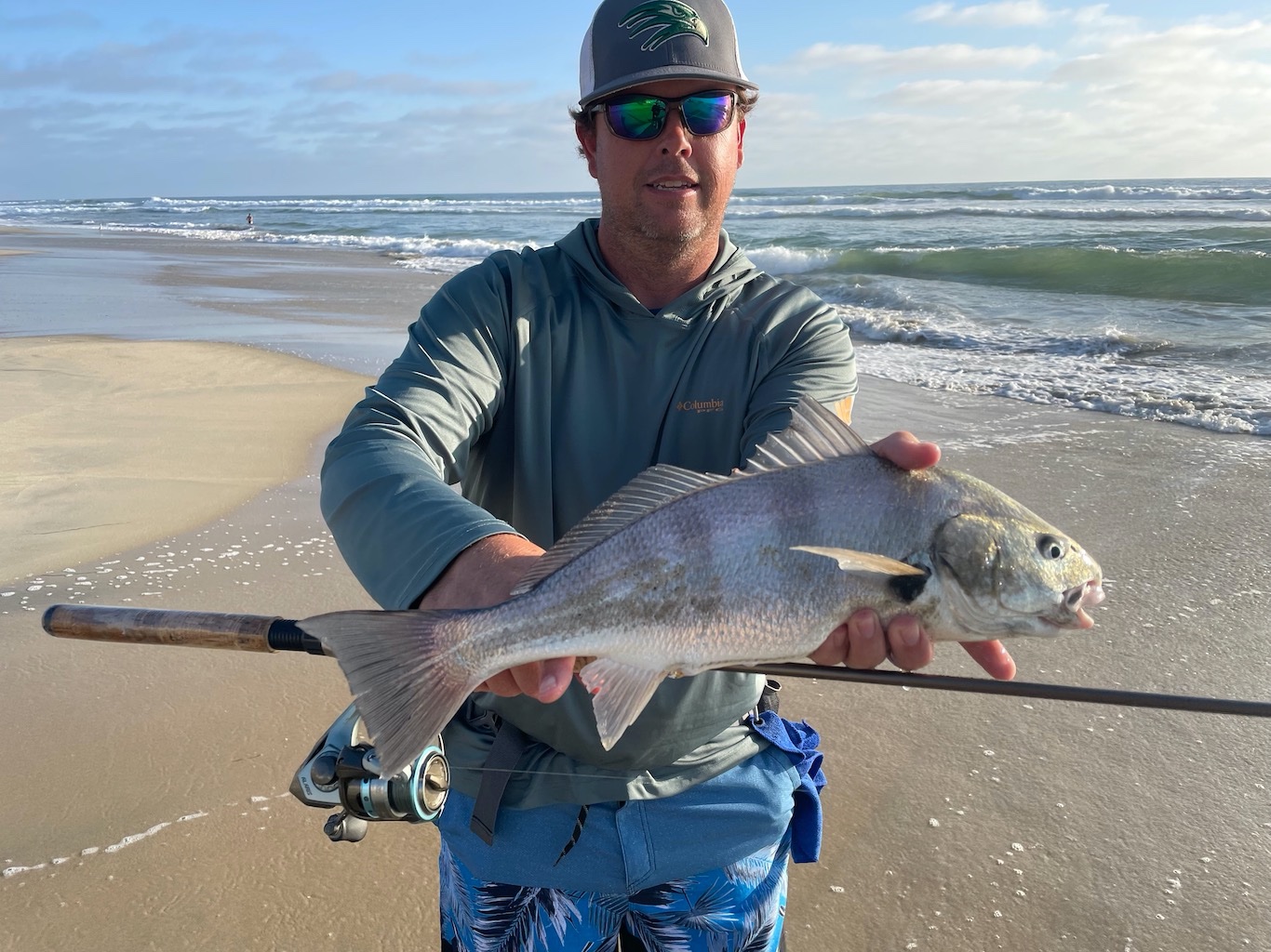 About 30 seconds later, here comes a lifeguard running down the beach heading out to help a surfer who had lost his board and was struggling getting back in. The lifeguard is running north, straight for my line as the fish is speeding south. Just as the lifeguard enters the water, I get his attention and tell him I've got a good fish on and the line is coming right at him. I wanted to make sure he didn't get clotheslined by the braid. He gave me the thumb's up, dove onto his longboard and skimmed right over my line (as I dove my rod tip down to the sand to make sure his board fins didn't ding my line). Right as he swims over my line, the fish goes crazy and takes off back out to deeper water.