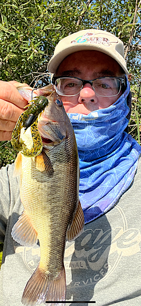 Missed 3 bites on plastic worms....just some tap, tap, tap and when I set the hook nothing was there. I wonder if they were bluegill or mini bass. Anyway, switched over to a brush-hog and landed a bass in between some branches and then later landed a pretty small bass on a craw bait. It was around 9 and was getting hot fast so worked just a little more and headed home. It was fun to get on the water even just for a short time and very refreshing on