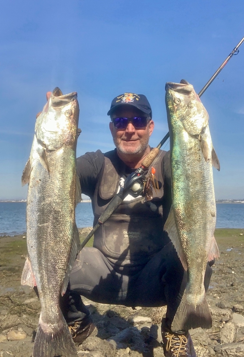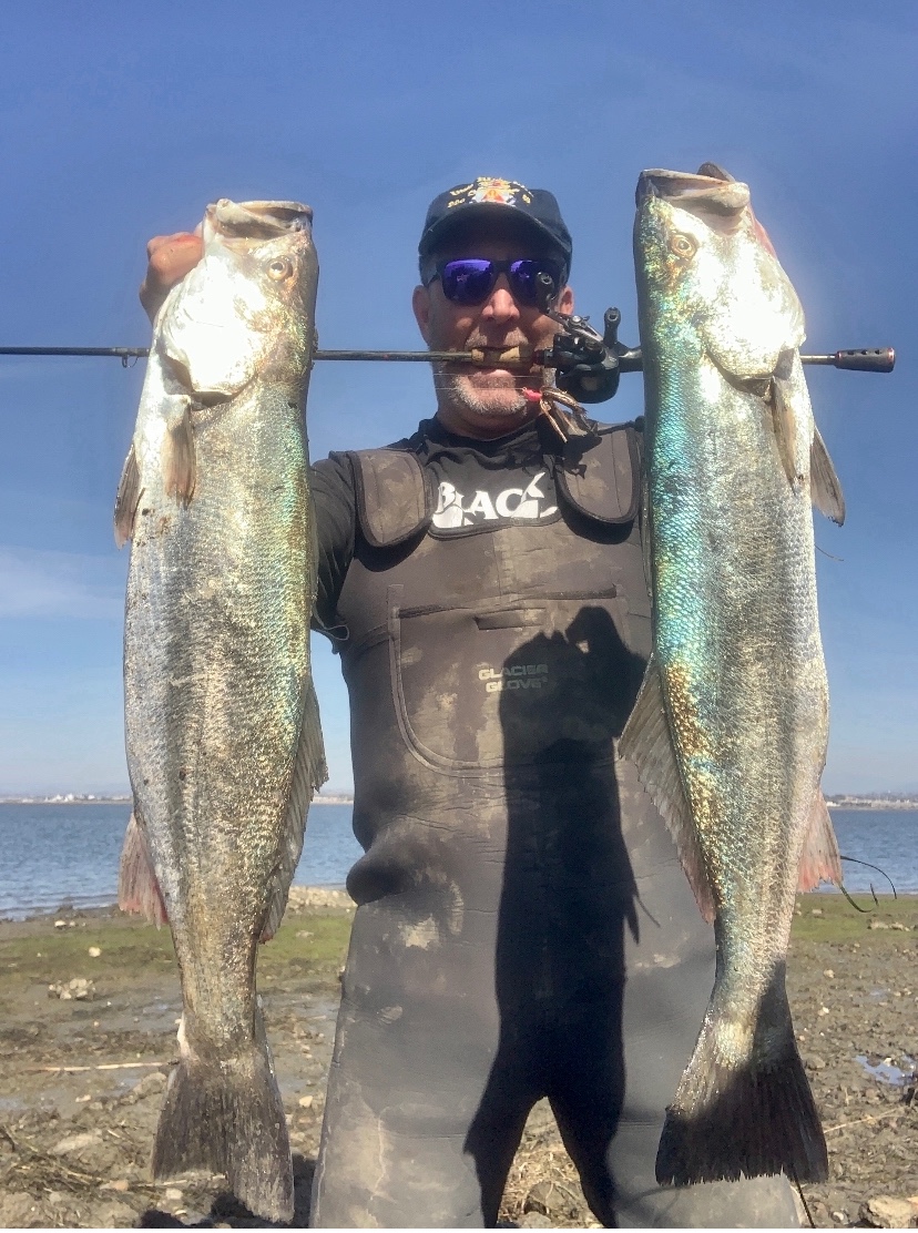 9 and 7 pounders. shore fishing south bay. 1/2 bass jig. 8lb test. unibutter.