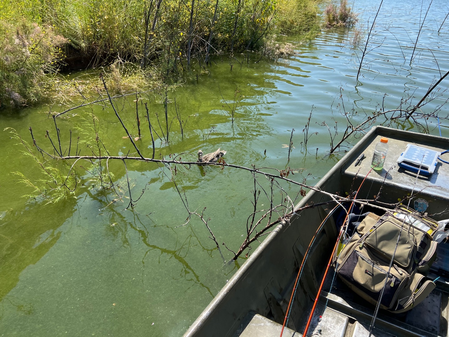 Rented a boat at San V today and a fellow SDFisher joined me for the morning. Some froggy looking water but no bites on either the frog or the buzzbait. Water is pea green soup from the grass scum - not just the surface, it’s throughout the water column in places.