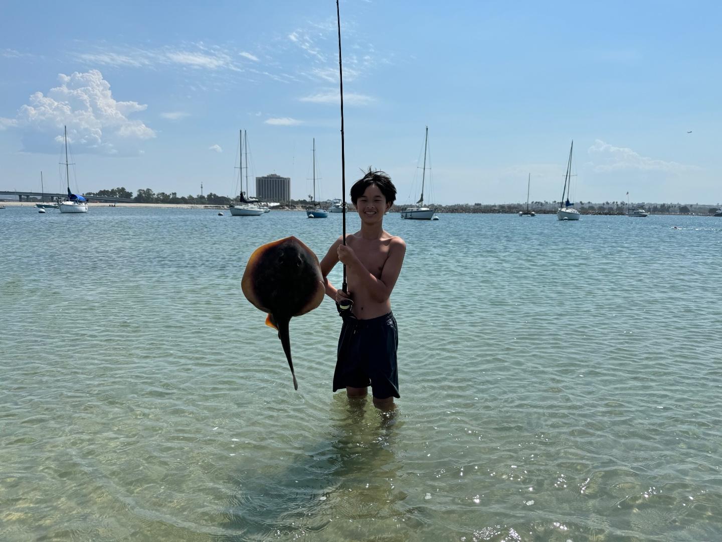 It was their first time shore fishing Mission Bay, and we did pretty well through mid-day. We got six or seven YFCs, couple spotties, a small sandy and two round rays.