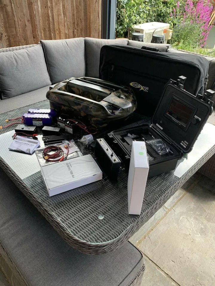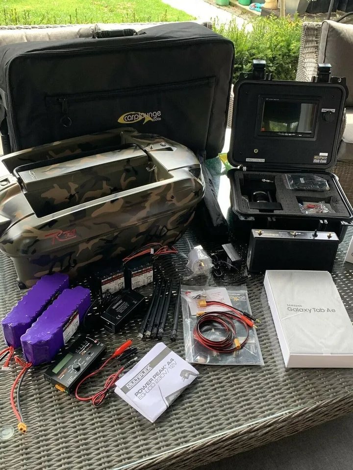 Up for sale is my used Rt4 Bait Boat complete with autopilot and Dragon Fly Fish finder and mapping of lake full software in excellent condition also comes with a Samsung galaxy Tablet two x extra high powered batteries and two medium high powered batteries full charging system and all aerials and extra leads for powering from batteries or additional battery module fish camera complete with winch and remote screen perfect for checking your bait presentation on the bottom of the lake the bait boat is also pre wired for bait spirals as well and this is probably one of the most spec boats.