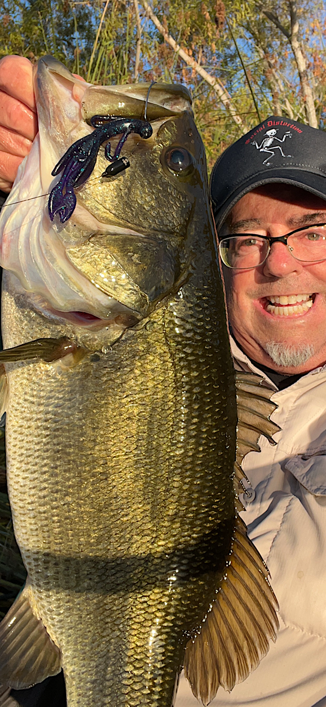 Decided to skip a trip to Murray and headed out to the SD river. Got there around 7:30 and there was even more surface area covered with a green film than last week. I imagine that with some good winter rains it will be able to flush out a lot of this yucky green water. On the positive side, after a few casts, it made my green braid line ever greener...ha ha Started off with a crank bait and later switched over to an underspin. Not much later, I decided to start flippin' as that is one thing that I have had my most success with the last number of years at the river. Started working a brushhog and I flipped it into some sunken branches and suddenly the line was heading out away from the shore.The bass in the SD river really fight hard and when I set the hook, I knew I had a nice bass because it started taking out drag and I set my drag pretty tight. The fight was on as it started digging in and it came out of the water 2 times and I just was hoping so much it would not come off. I finally landed it and being very jazzed is an understatement.