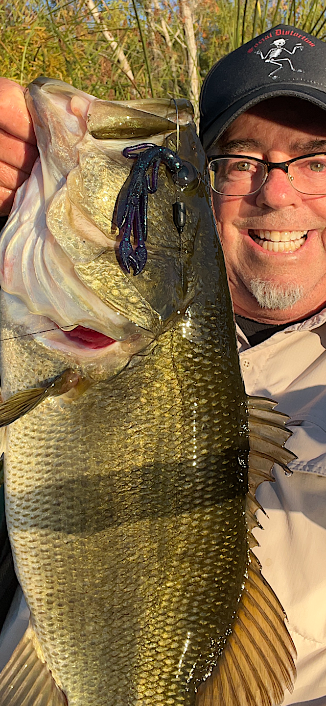 Decided to skip a trip to Murray and headed out to the SD river. Got there around 7:30 and there was even more surface area covered with a green film than last week. I imagine that with some good winter rains it will be able to flush out a lot of this yucky green water. On the positive side, after a few casts, it made my green braid line ever greener...ha ha Started off with a crank bait and later switched over to an underspin. Not much later, I decided to start flippin' as that is one thing that I have had my most success with the last number of years at the river. Started working a brushhog and I flipped it into some sunken branches and suddenly the line was heading out away from the shore.The bass in the SD river really fight hard and when I set the hook, I knew I had a nice bass because it started taking out drag and I set my drag pretty tight. The fight was on as it started digging in and it came out of the water 2 times and I just was hoping so much it would not come off. I finally landed it and being very jazzed is an understatement.