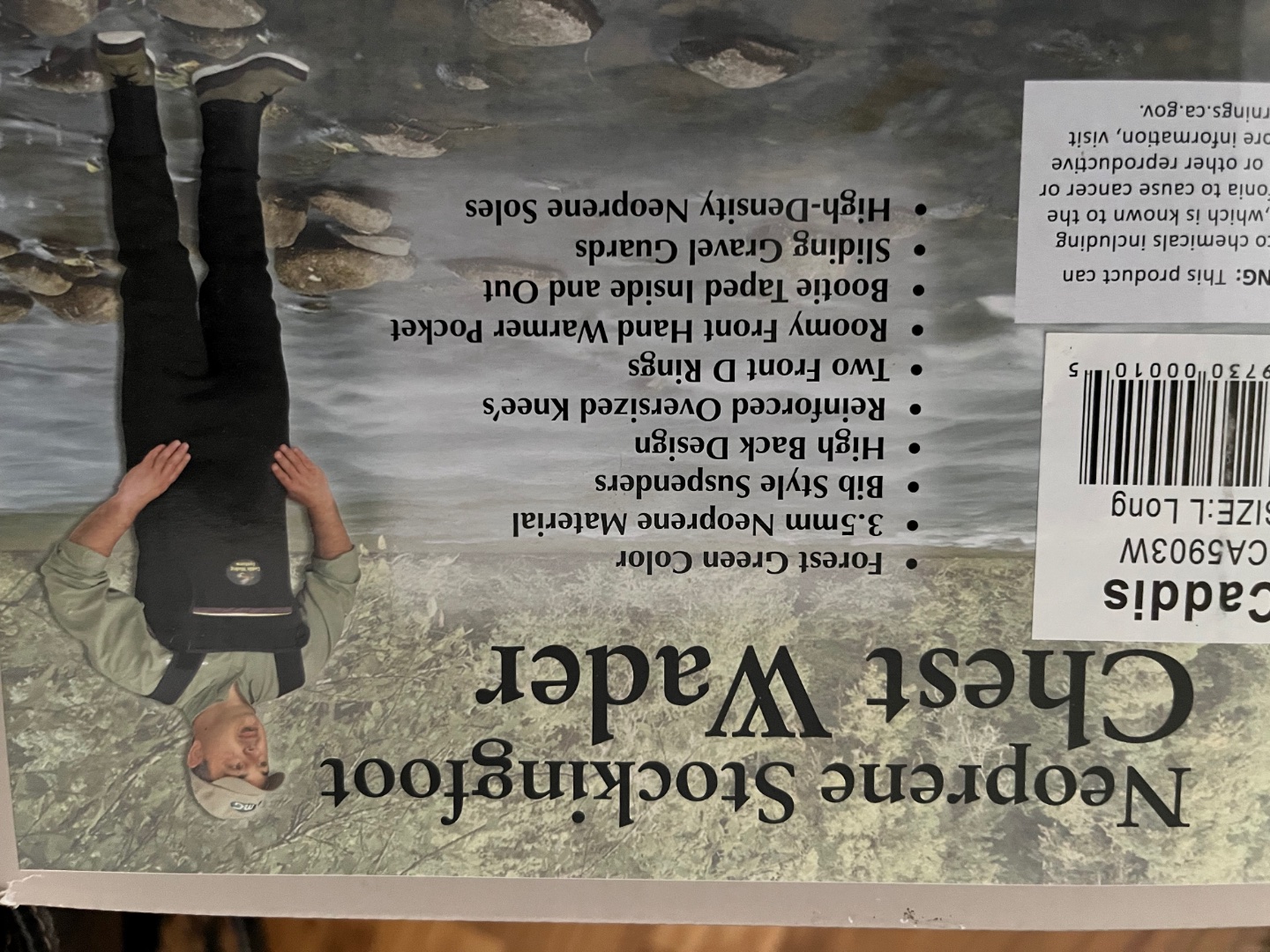 New caddis neoprene stockingfoot waders. Bought these in size large/long for my son. They fit, but are a little too long, and the foot is a little narrow. He wears a 13 shoe. Getting him the XL regular length. If you’re taller and wear under a 13 shoe these should fit perfectly. Tried on once and that’s it. $80