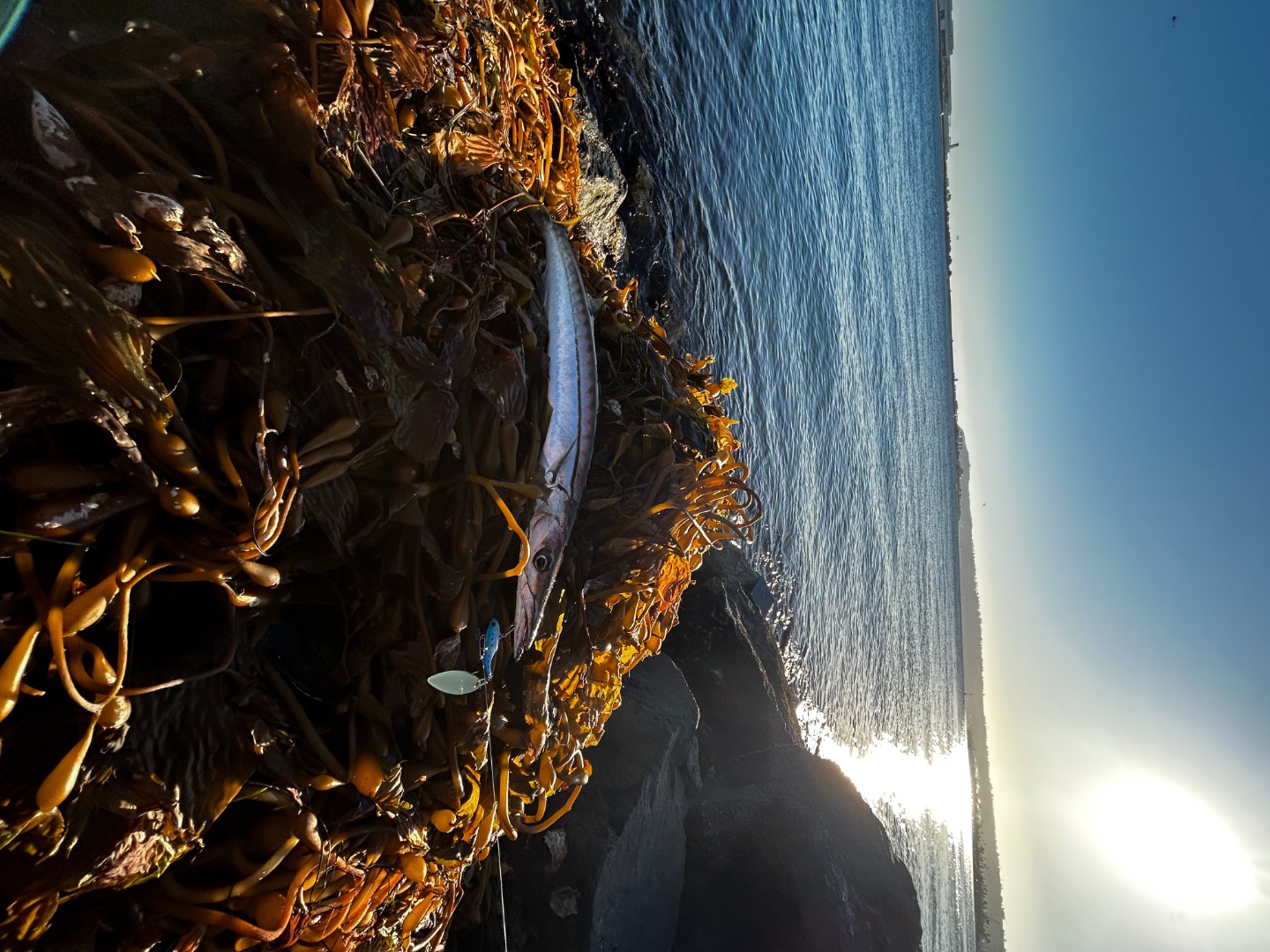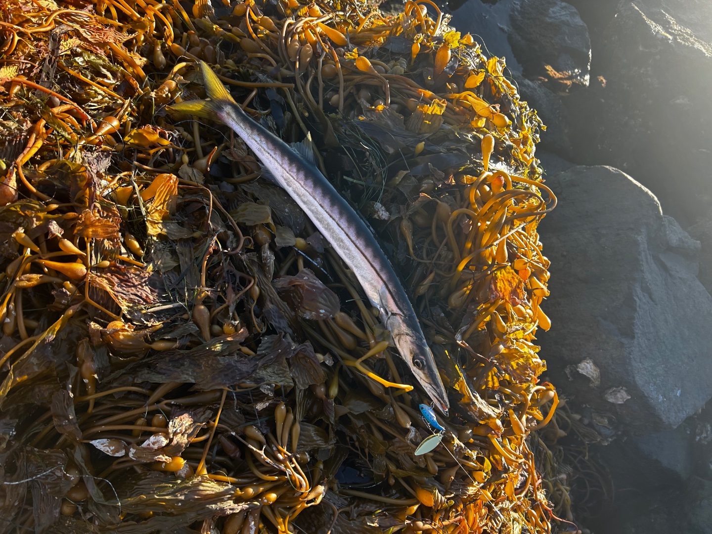 Kelp paddy cuda! My wife got one on Saturday south of the bridge, looks like some juveniles are coming in.