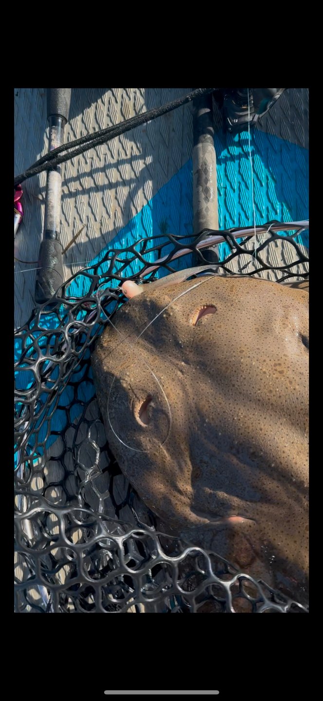 After a few minutes, I got color - brown on top, white on bottom, it's a halibu-oh dang it's an angel shark!! never caught one before and was thrilled to have one on the end of the line. thankfully my net was just wide enough to get his head into. he was surprisingly calm as I brought him on the board, but with a fish of that size on a paddleboard, even minor thrashing can mean chaos, so I quickly got some pictures and video, pulled the tube bait out of his upper lip, and let him swim off. no way to measure him on the board but at least 40 inches or so. and he was heavy lol.