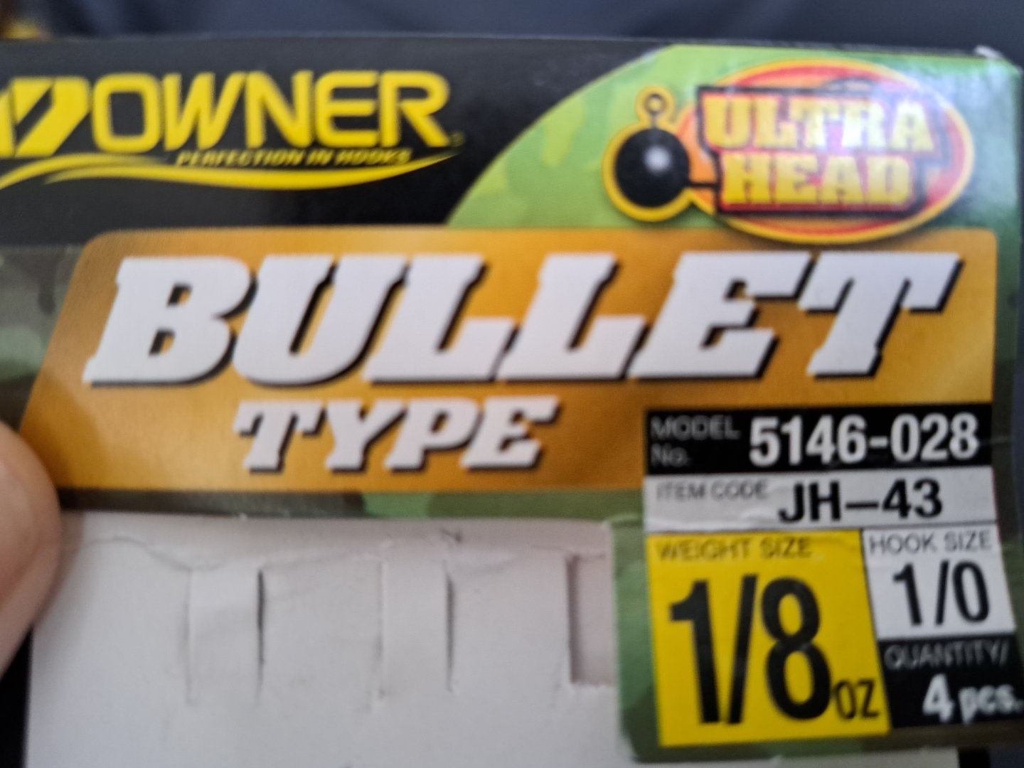 The smaller bullet type (1/0) hook has a fixed weight at the eye like a sled head. I use those for the slimmer profile baits and when there is no wind. Total weight 1/8 oz.