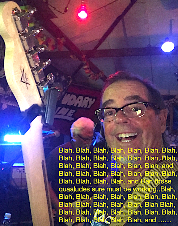 I just got a mental image of Vinny with a guitar shaped fishing pole throwing plastic worms while under the influence of qualudes and weed. It didn't work. He still fished fast, and although slurred, the words still poured out.