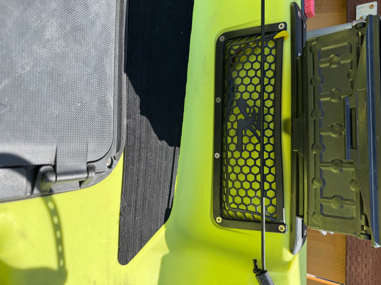 - Upgrade Hobie rectangle hatch + drop in bin fits 3 3600 size boxes plus mesh pocket