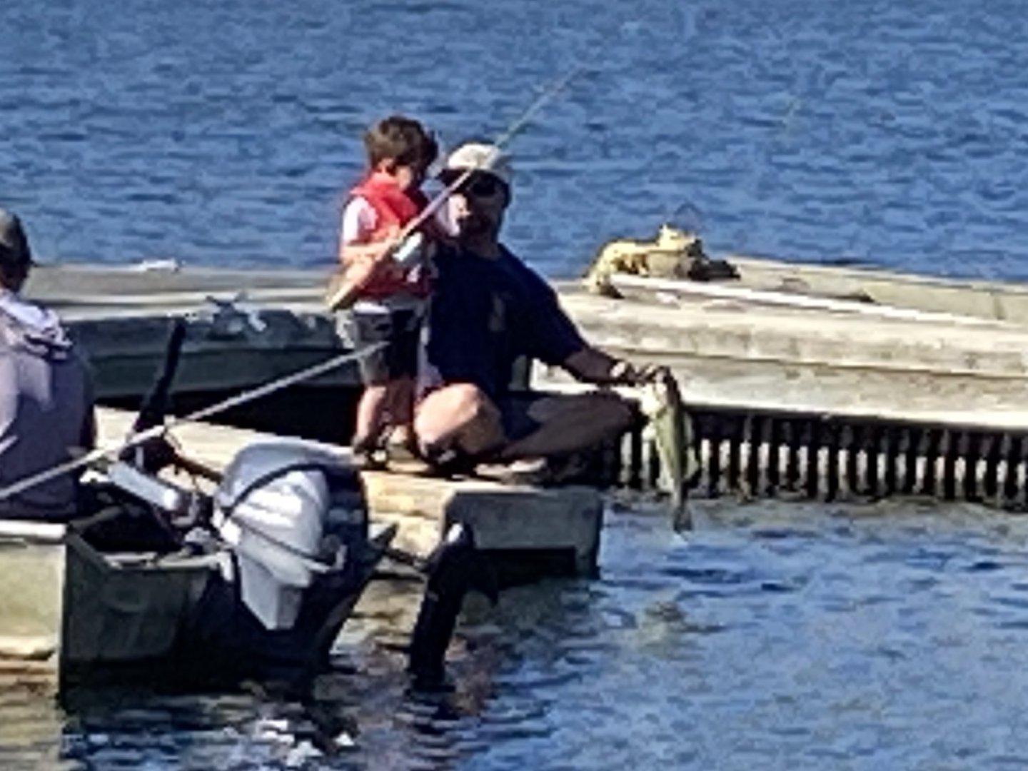 There was a Dad with his son on the dock. Dad had to hold his kid while he fought the fish, It was fun to watch.