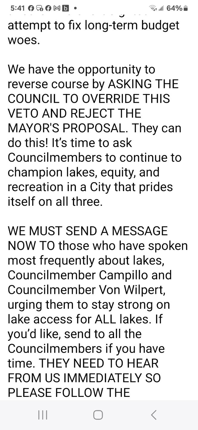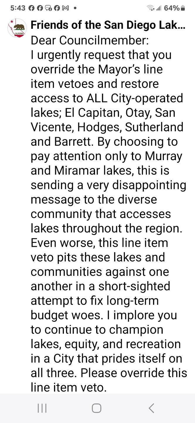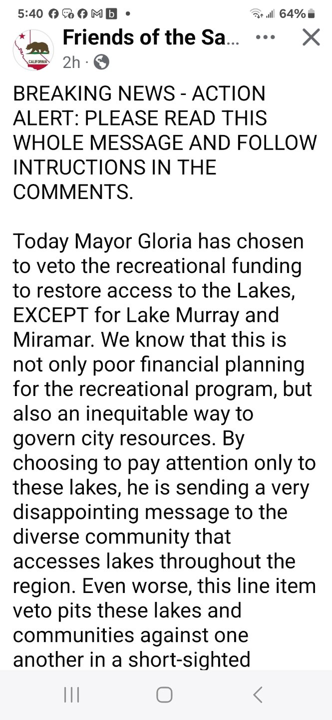Hi Tommy,TommyP wrote: Tue Jun 17, 2025 3:48 pm We are close but the mayor just stepped in and used his line item veto for all the lakes except Murray and Marimar. If you are on Facebook go to the Friends of SD Lakes to use a suggested email to send to the council members. If we can get six votes from the council we will WIN. Or you can just call or email the individual councilmembers as I have done. Time is of the essence.