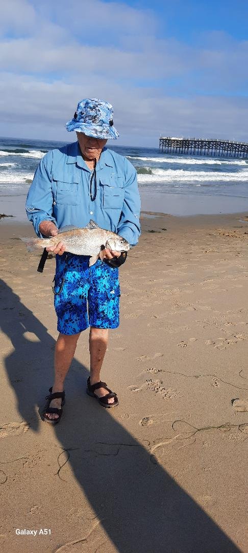 Had a few leftover bloodworms getting ripe in the frig so headed out to MB this AM. Conditions not ideal, strong surge, somewhat dirty water & lot of salad. If not bit within 3-4 minutes, line loaded up with grass. Not that I was getting any bites, nary a nibble. After an hour decided to head up to PB and set up by the LG station just south of pier. Little less current, cleaner water & lighter amount of grass to contend with but still not even a nibble for almost an hour. Was just about to pack it in around 8 when got a perch bite. Re-loaded with 2 piggy backed crabs and on next cast felt like some faint nibbling with a fish massaging my bait in its mouth and then tension in the line, set the hook. Line peeling and brought a nice 18" spotfin up on to the sand. All my fish unless bleeding out are photo & release. Sorry Butch this one didn't have your #8 in it's lip but he'll be waiting for you ! LOL.
