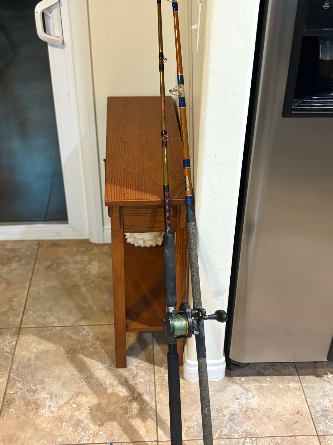 Comes with an excellent condition Ugly Stik Tiger 7'' 30-50# test rod and a custom, second-hand 8' 50# bait stick: ceramic guides and a Fuji reel seat. I was told the blank is 'Rainshadow and it is a good blank, but I can't verify. With its length and power, it quickly drags the tuna to the boat, which is what deckhands want.