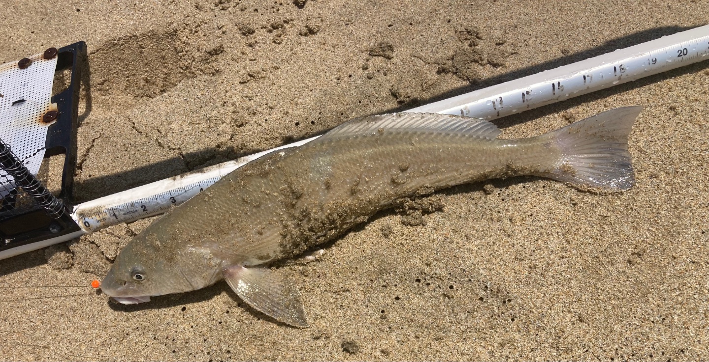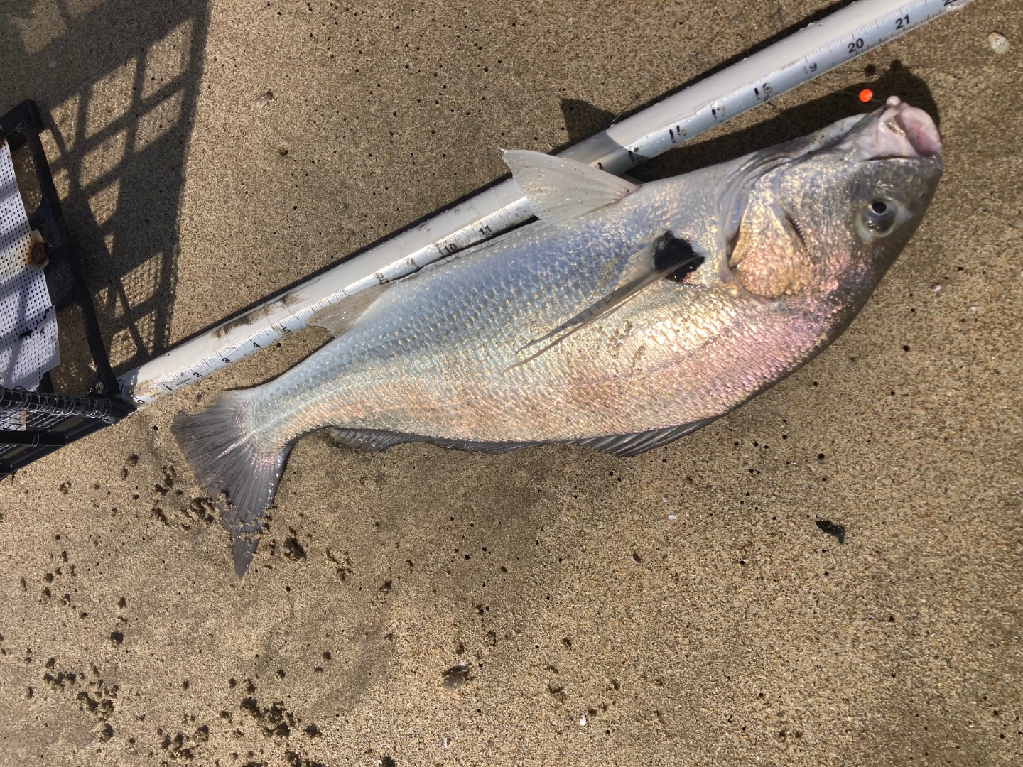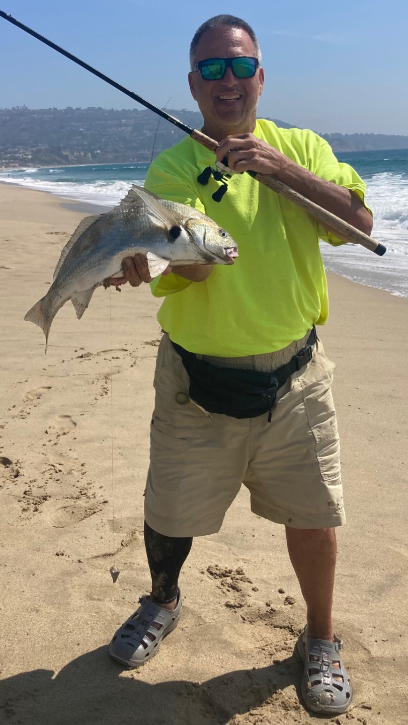 The corbina and croaker were biting in close today. This 18” corbina ate a thumb sized soft shell and the not so common spotfin ate 2 small soft shells.