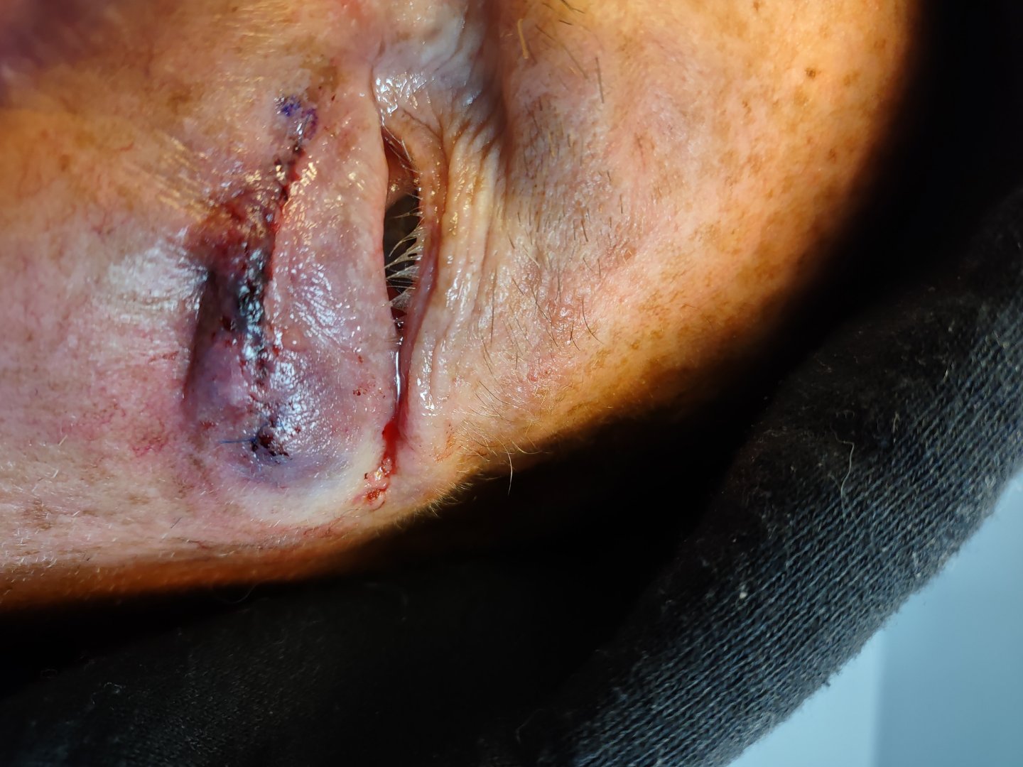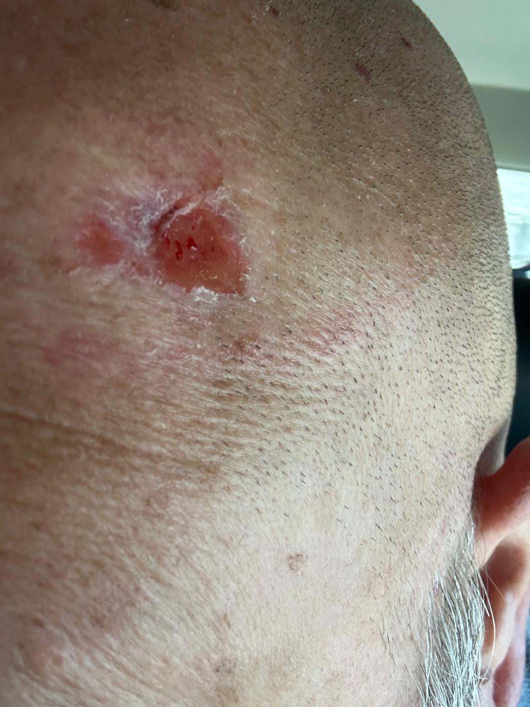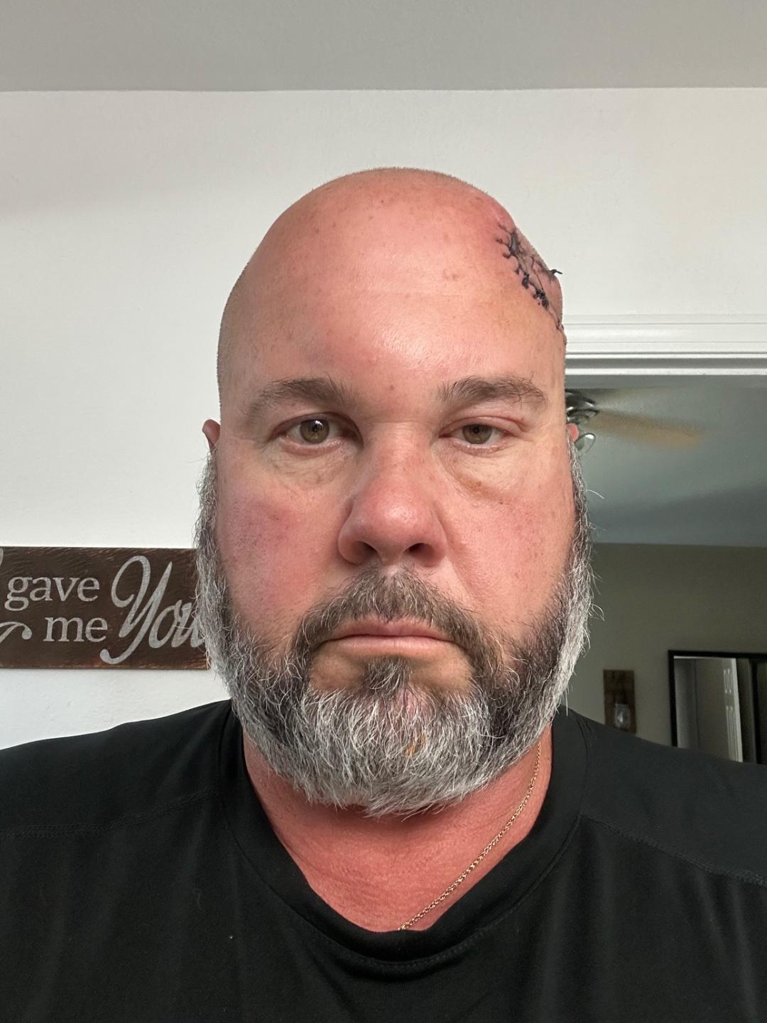 This past Friday I had to have, what was thought to be, a dime sized spot of skin cancer removed from the left side of my forehead. Well once they started to remove it they found that the cancerous tissue went deeper and farther towards the back of my head. By the time they got it all they had to take a 4”x2” section of skin from the side of my skin, all the way down to my skull.