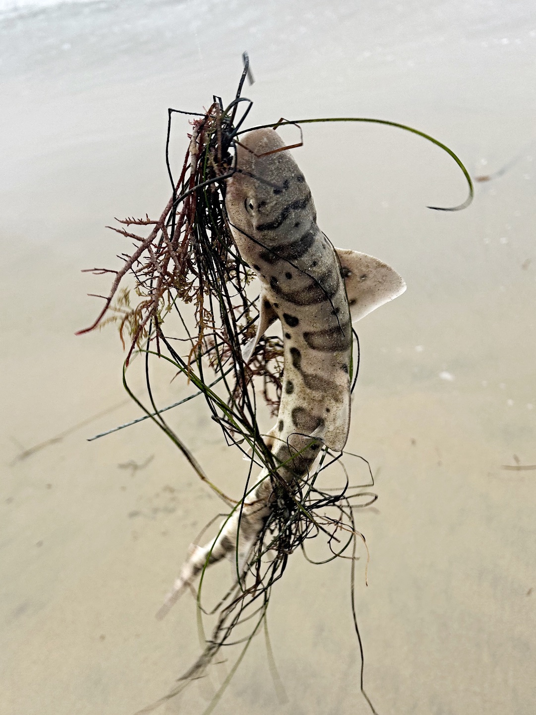 Conditions were a bit messy, but they've certainly been worse. I was frequently pulling in grass, and my line tangled a couple times. Chalking most of my messes up to not being used to the thinner braid line just yet and needing to be a little more careful with it as I reel it in. However, fish were caught. Started with very large perch that I thought had chance of being a corbina, and a steady (but relatively slow) pace from about 7am - 10am. I wasn't counting but it was 5-6 or so. I pulled in another baby leopard shark halfway through the session, and the picture below captures some of the grass that was coming in all morning. Once the gray skies turned to actual rain, I took it as my sign to pack things up for the day.
