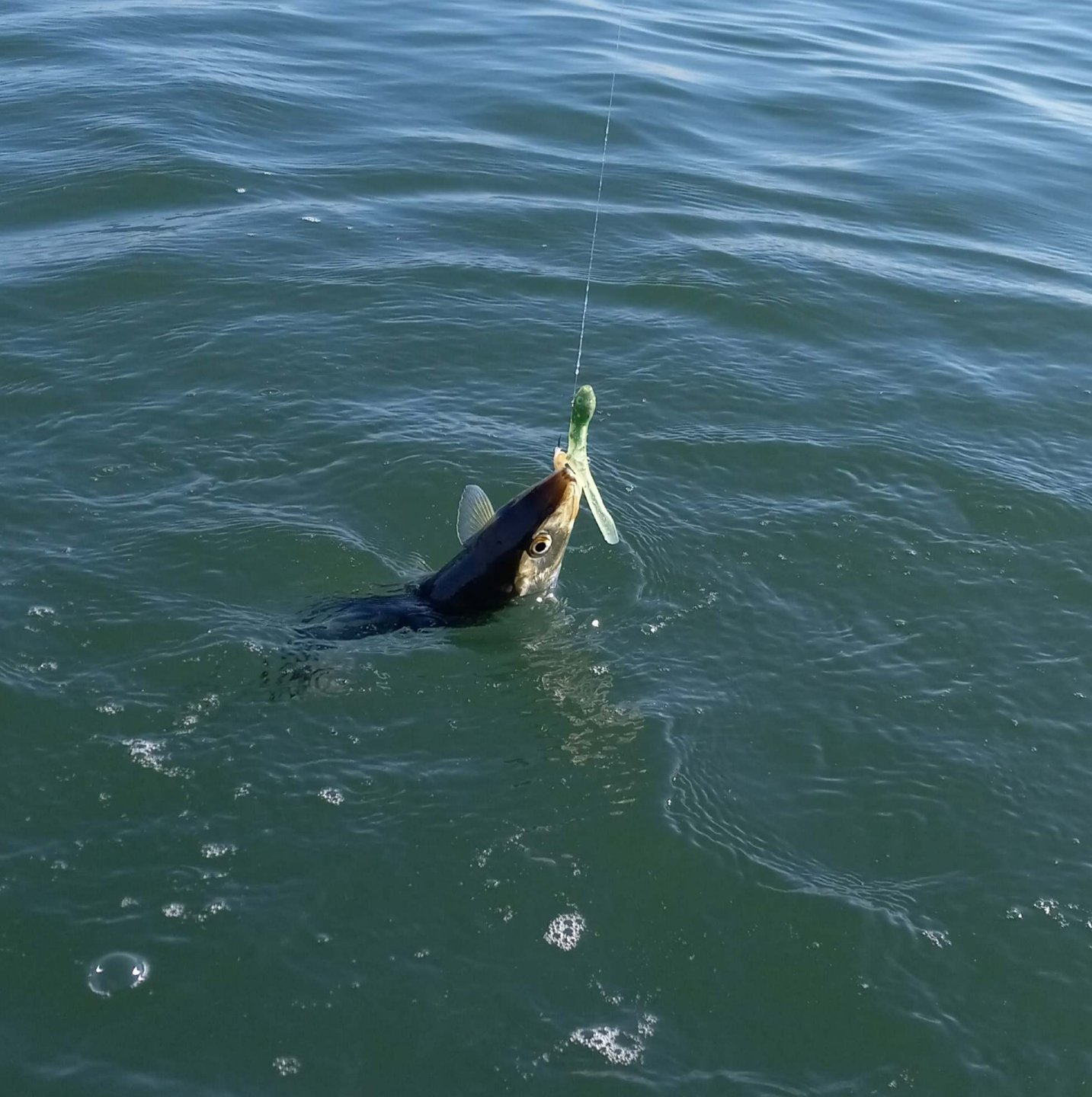 ...ScorcherZ tube baits, underspins, and ball heads with 4 inch grubs. The fish seemed to like less sparkly plastics today. Green and red plastics, rather than the chartreuse bits. And ScorcherZ-wise, it was all about the green leadhead in a clear tube...note the pics.....
