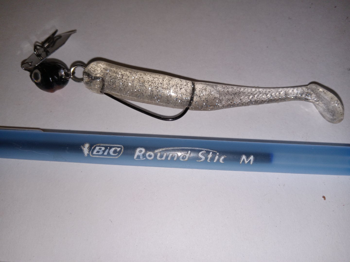4 inches long. Skinny as a bic pen. 10 grams/.4 ounces. Ultimate goal is to add a short skirt that covers the split ring...hollow core so the body can wiggle. Bigger chatterbaits chop through the grass and are 94.7% weedless. Hoping this will be, too.