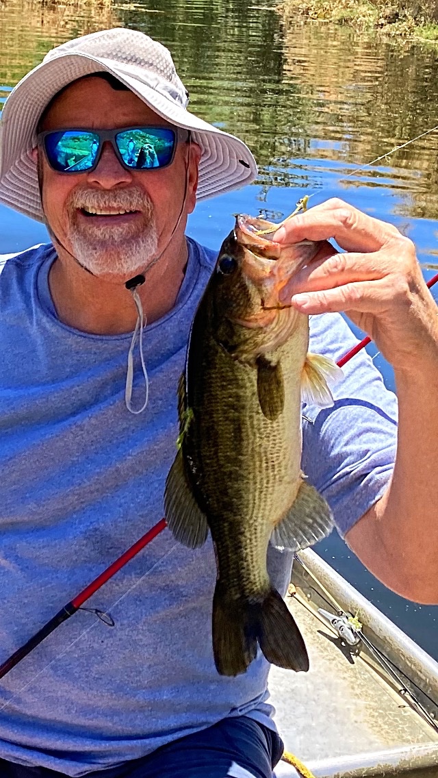 First I’d like to thank Dave G and Laurie for helping set this up. I have been fishing with Tony for a few months, he has Stage 4 Lung Cancer and needed some time on the water. I have been fishing Newport Bay with him, kind of training him to fish for Largemouth Bass. The skills you learn from fishing for Spotted Bay Bass transfer very well for fishing Largemouth. Casting accuracy, feeling the jig, setting the hook. Now Tony is a slow starter, so we didn’t make it to the Lake until 11:30 but that was OK because Dave allowed us the use of his rental Boat when he was finished and Laurie allowed us to come in late and use the boat. I’m a Hauser guy so we headed off to the Cove and I saw a lot of Grebes diving, many with Chicks hanging on to their backs. We trolled some small Shad Raps thru the birds and Tony was the first to hook up. He was very excited and his fish turned out to be a big Bluegill. The trolling wasn’t very productive for us so we switched up and started throwing 5 inch Shad Worms on 4/0 EWG hooks. A pattern developed where we could cast to live submerged Cottonwoods and let those Shad Worms sink out. The line would twitch and start running out. Tony hooked up first, and whooped and hollered at his first Barrett Bass. We worked that pattern, Me putting the boat in the right spot in the afternoon breeze, and Tony casting to the Trees for the rest of the day. I tried to set up on spots we could each cast to an individual Tree. Some Bass would dive deep in the branches, some came unbuttoned, but we landed 12 of our 20+ hookups during the windy afternoon bite. With no Pedestal Seats our Bodies gave out around 5 pm, our lower backs screaming and we headed back to the Dock. Tony was happy as a Clam with the most Largemouth Bass in a session than he has ever caught in California waters. The trip a total success, he will remember this trip and tell fish stories about it to his buddies. That is what it is all about.