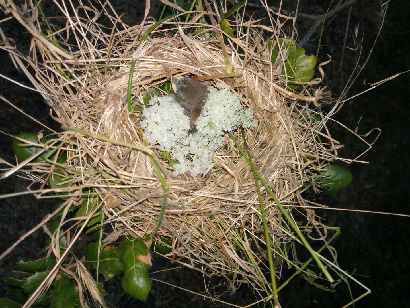 Hunted around and found an empty nest nearby. the nest had a hole in the bottom. I stuffed some flattop buckwheat tops in it to block the hole, and put the bird in.