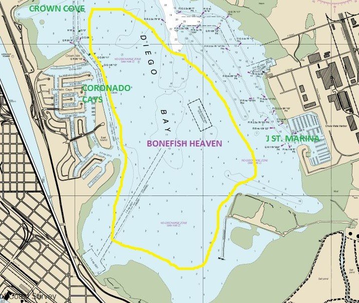 Bonefish are a hell of a fun species to target. The South Bay has a bunch of them. Focus on the flats down south near the Cays and outside Crown Cove. The square mile flats hold them too. Some of the bigger bonefish I've heard of being caught were in Glorietta Bay. Liberty Station and Pepper Park have a bunch as well. Best months to target them are May-August. They love small grubs, and will hit swimbaits from time to time. But drifting a live ghost shrimp(2"-3.5") on a C-Rig with 4#-6# line is the best way to target them IMO.