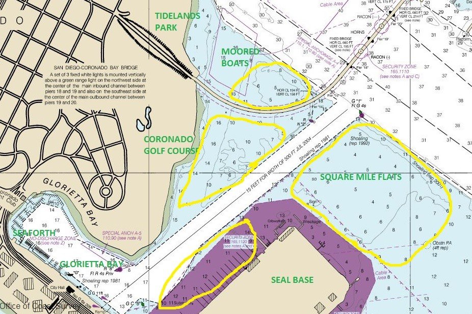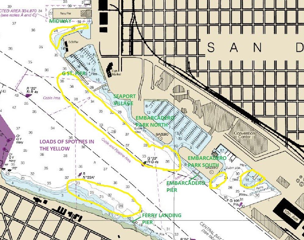 All of those spots in the yellow have produced multiple 30+ fish outings, and I usually share this map with those who are having trouble catching fish in SD Bay, or who are traveling to SD Bay to get on some fish.