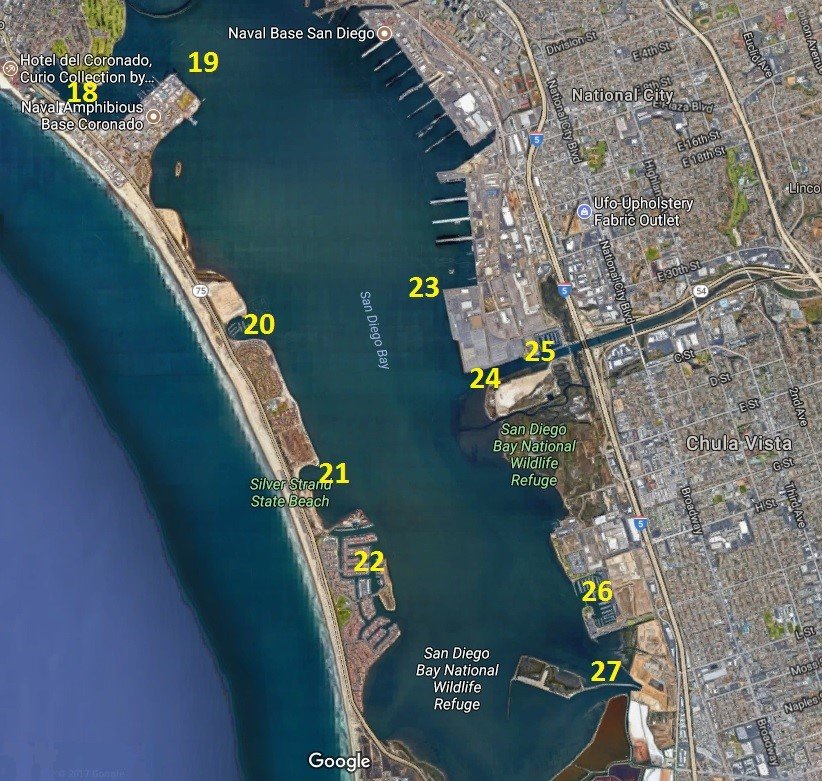 If you just want to catch spotties from shore, you can go anywhere on Shelter Island, Harbor Island, Liberty Station, Tidelands Park, Glorietta Bay, J St, Pepper Park, Spanish Landing, Ferry Landing, Crown Cove, Fiddlers Cove, Seaport Village, Embarcadero Park, and Coronado Golf Course. That's right, you can park your car in their parking lot, walk along the cart path only, and access the waters edge to wet a line. It's kind of a bit of trouble just to catch a few small bass, but I'm just putting the info out there for you to take in.
