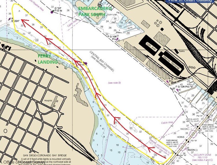 From the bridge, and in the middle of the channel, is really good when the drift is just right. You can literally pick fish off on almost every cast from the bridge all the way past the Midway at times. You can almost make the same drift in more shallow water but you'd have to start near the Ferry Landing. Having a fish finder and making waypoints is a must so that you can start in the same area. On the other side of the channel but in the same area, these areas marked in yellow along the Embarcadero have put out some great numbers as well.