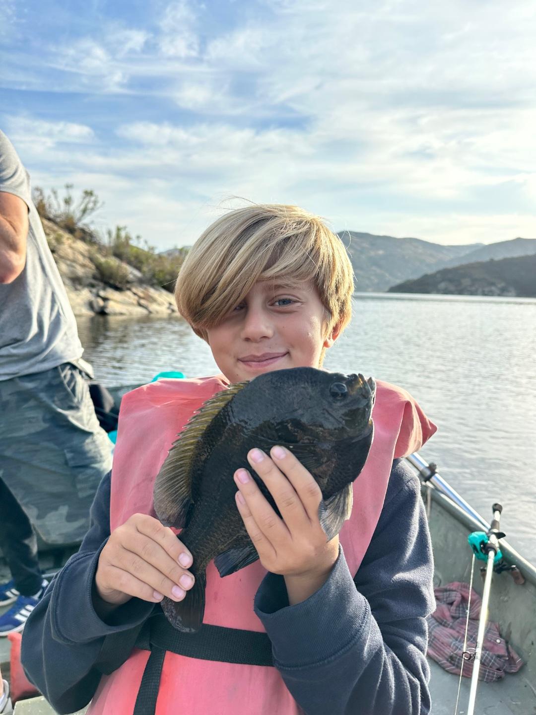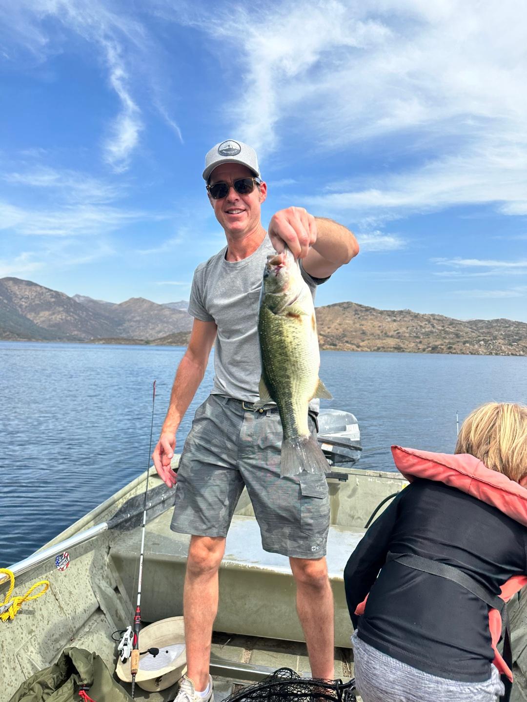 We were on the water at 4:30. We didn’t know you had to reserve motor boats, so they gave us a rowboat and told us to check back in later. Thanks to the dudes who came by to check on us (because we were rowing). First bass was at pigs at daybreak. Bluegill a short time later at those big rocks near desolation point. Rowed back to the dock around 8 and took a motor boat out.
