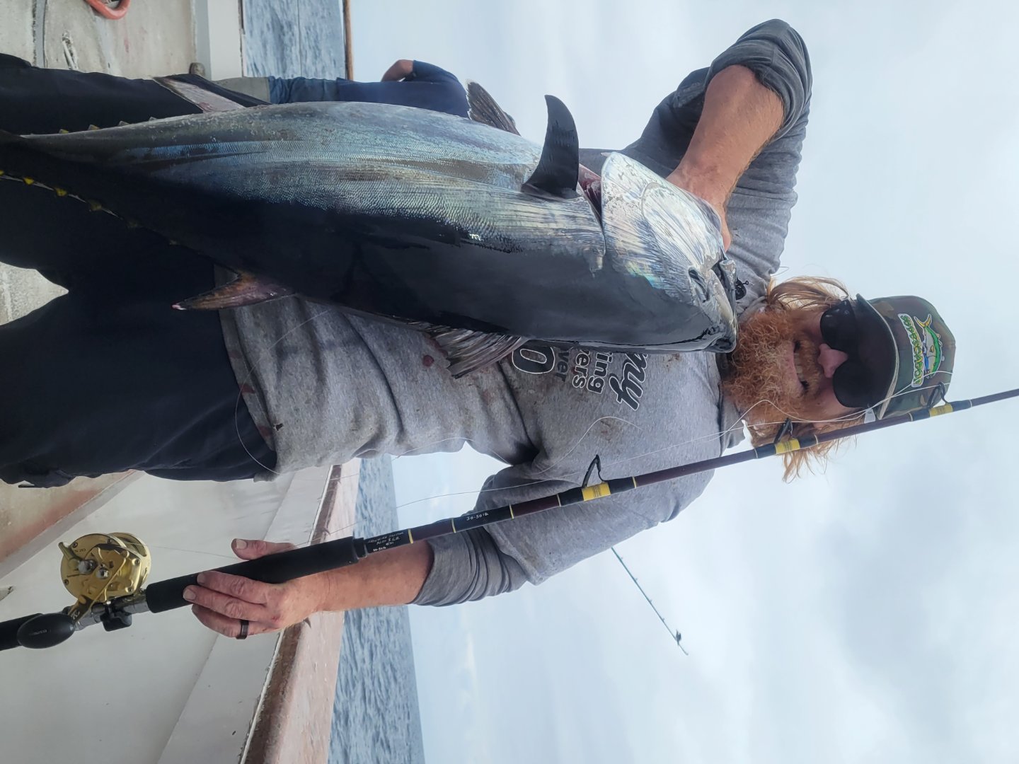 Next trip--------> We had a small window of biters on the night bite, I had a good one on a sinker rig but got sawed off by a guy fishing a lexa with a 3 ft floro who had no idea where his line was (I was on the bow and his line had wrapped around everyone from the stern). Oh well. Graylight came and I put one on at about 40 pounds with the 5x. I stowed my gear and went to deckhanding. I had helped the passengers with rigging on the way out, now I took to gaffing and staying with less experienced anglers. I assisted with tangles and was there when folks needed a break. I would tell the fisherman "let me know when you want the rod back..." Sometimes they wanted it back, sometimes they asked me to kill it. I put over 15 or so on deck in that fashion, 30 to 50 pounds. At one stop they started slowly biting so I grabbed my Sabre 539 and sacked up. They only wanted a1 Michael Phelps baits and for some reason i wasn't getting any love on my 30 pound floro. I dropped down to 20 and was bit instantly in the corner. My fish came over the rail after about an hour, 60 plus pounds of it haha. Overall great experience with my Old Glory family, they sure run a helluva show. PLEASE DO NOT FISH CRAP ASS GEAR OR SMALL LOW PROFILE BAITCASTERS FOR THESE TROPHYS, IF YOU DO NOT UNDERSTAND THE REASON WHY PLEASE ASK A CAPTAIN OR DECKHAND.