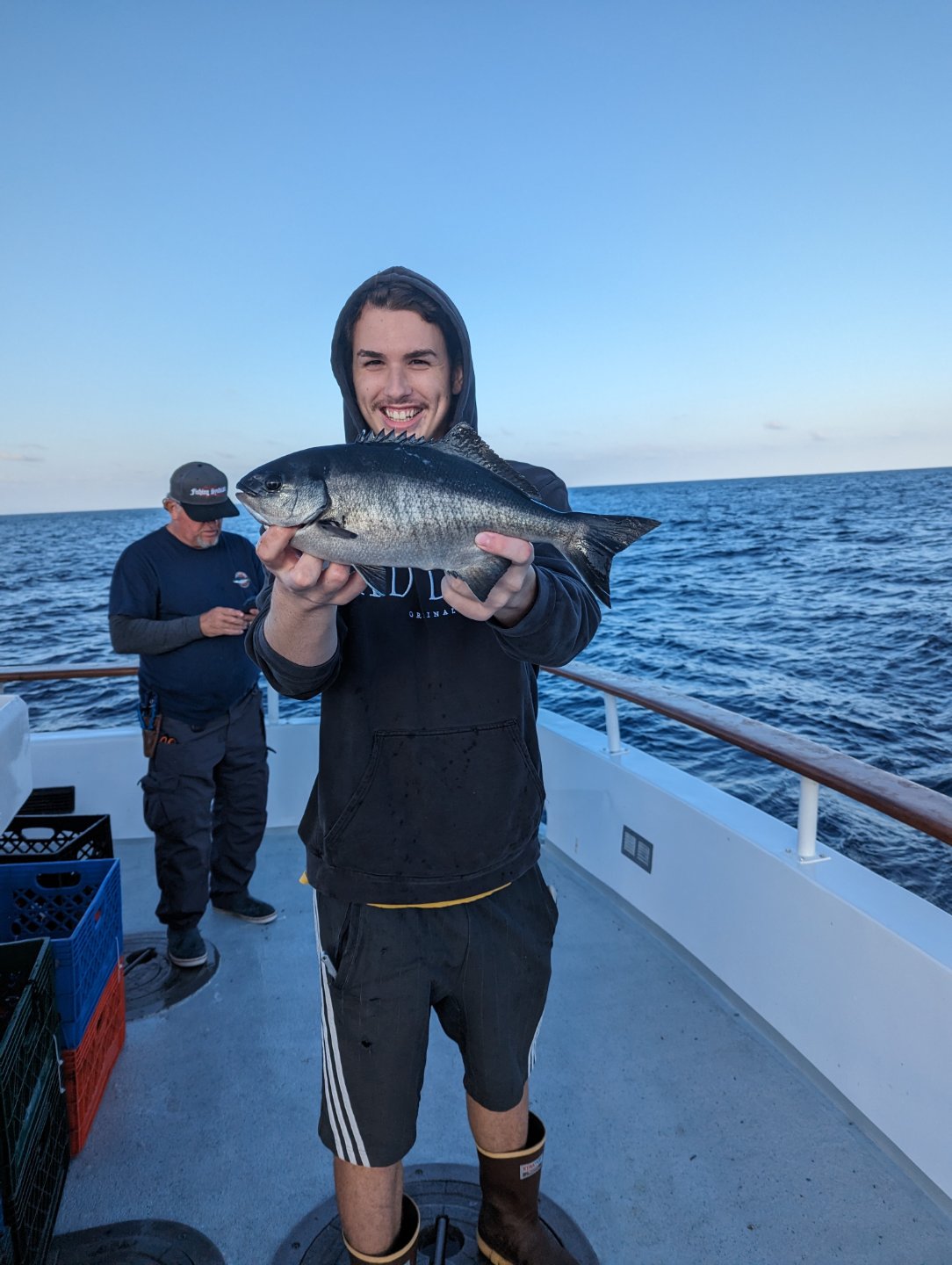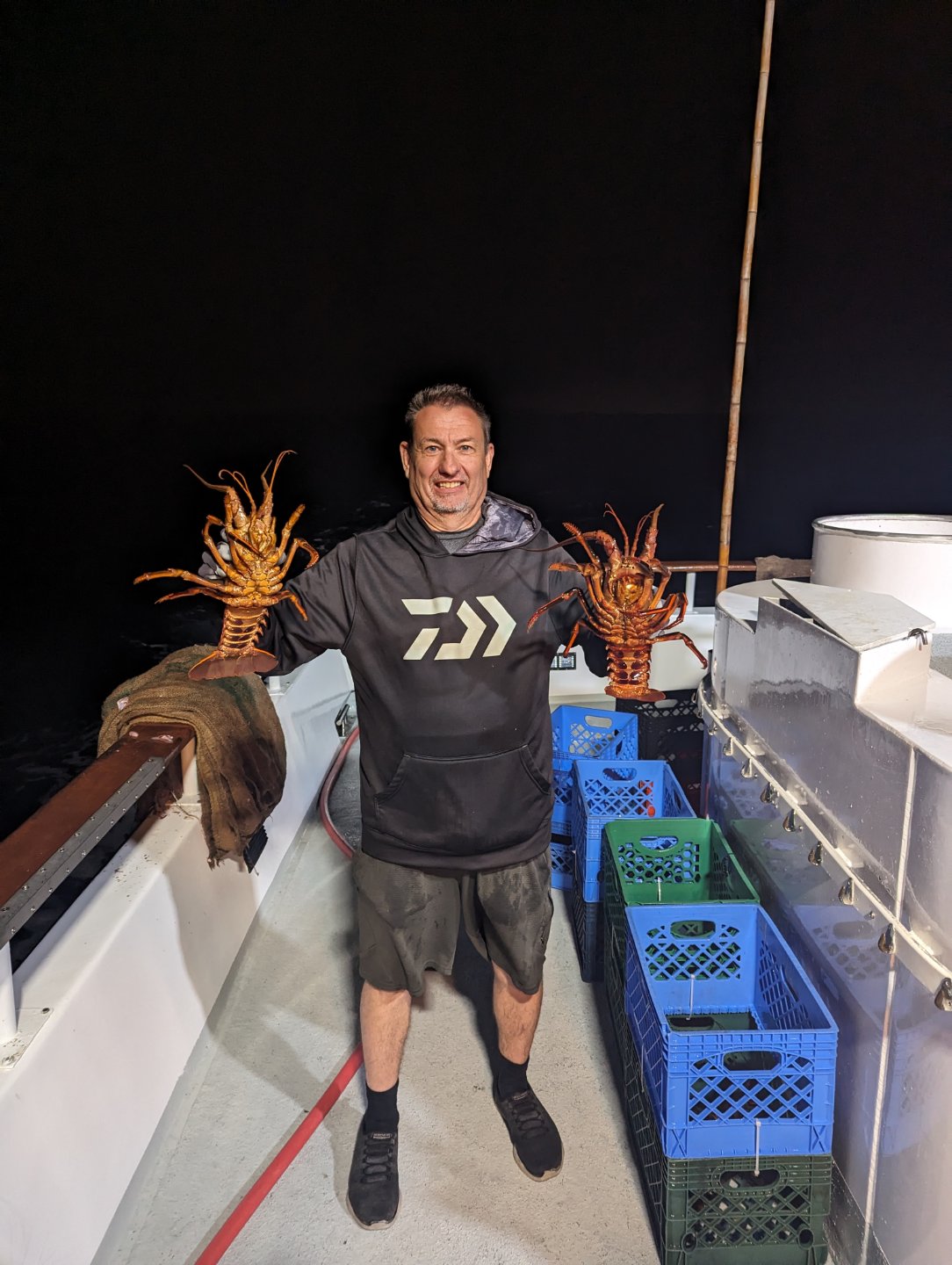 My son is out for the weekend from college, instead of meeting him for dinner, I like to spend the day outside fishing. We tried something new in lobster fishing. We did a noon to midnight on the Triton out of La Harbor, a half day fishing and half day lobster at Catalina Island. Since its lobster fishing only 10 people are allowed on the 65ft boat, amble room for fishing. Took about 2 half hours to get to Catalina. First stop fishing was basically all you wanted white fish. The second and third stop was really fun fishing. It was huge sheephead, sculpin, and halfmoon, all were nice size with lots of 5lb sheephead. Them halfmoons really fight for their size.