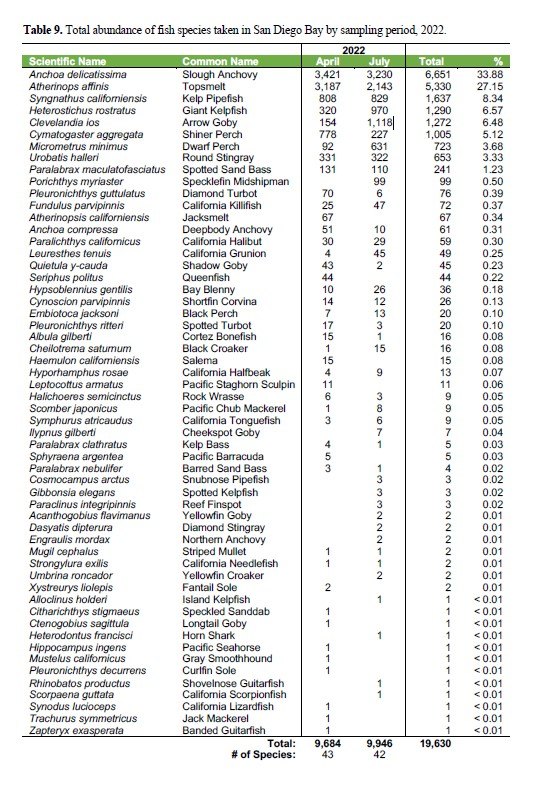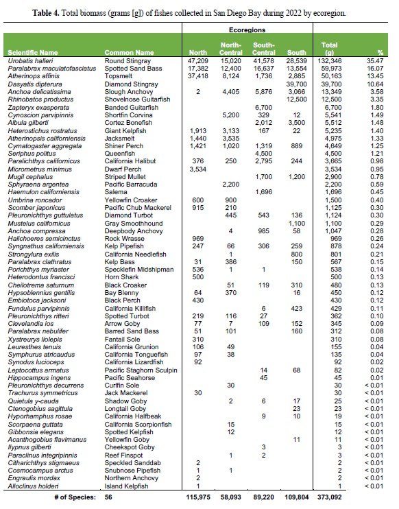 A summary of the results is as follows: Composition and Abundance During this study, 19,630 (56 species) fishes weighing a total of 373.1 kilograms (kg) were recorded during April and July 2022. The most numerous species comprising 33.9 percent (%) of the catch was Slough Anchovy (Anchoa delicatissima), followed by Topsmelt (Atherinops affinis; 27.2%), Kelp Pipefish (Syngnathus californiensis; 8.3%), Giant Kelpfish (Heterostichus rostratus; 6.6%), and Arrow Goby (Clevelandia ios; 6.5%; Table 3). In terms of biomass, Round Stingrays (Urobatis halleri) dominated the catch comprising 35.4% of the biomass, followed by Spotted Sand Bass (Paralabrax maculatofasciatus; 16.1%), and Topsmelt (13.5%). These species are typically among the most dominant species in surveys of San Diego Bay.