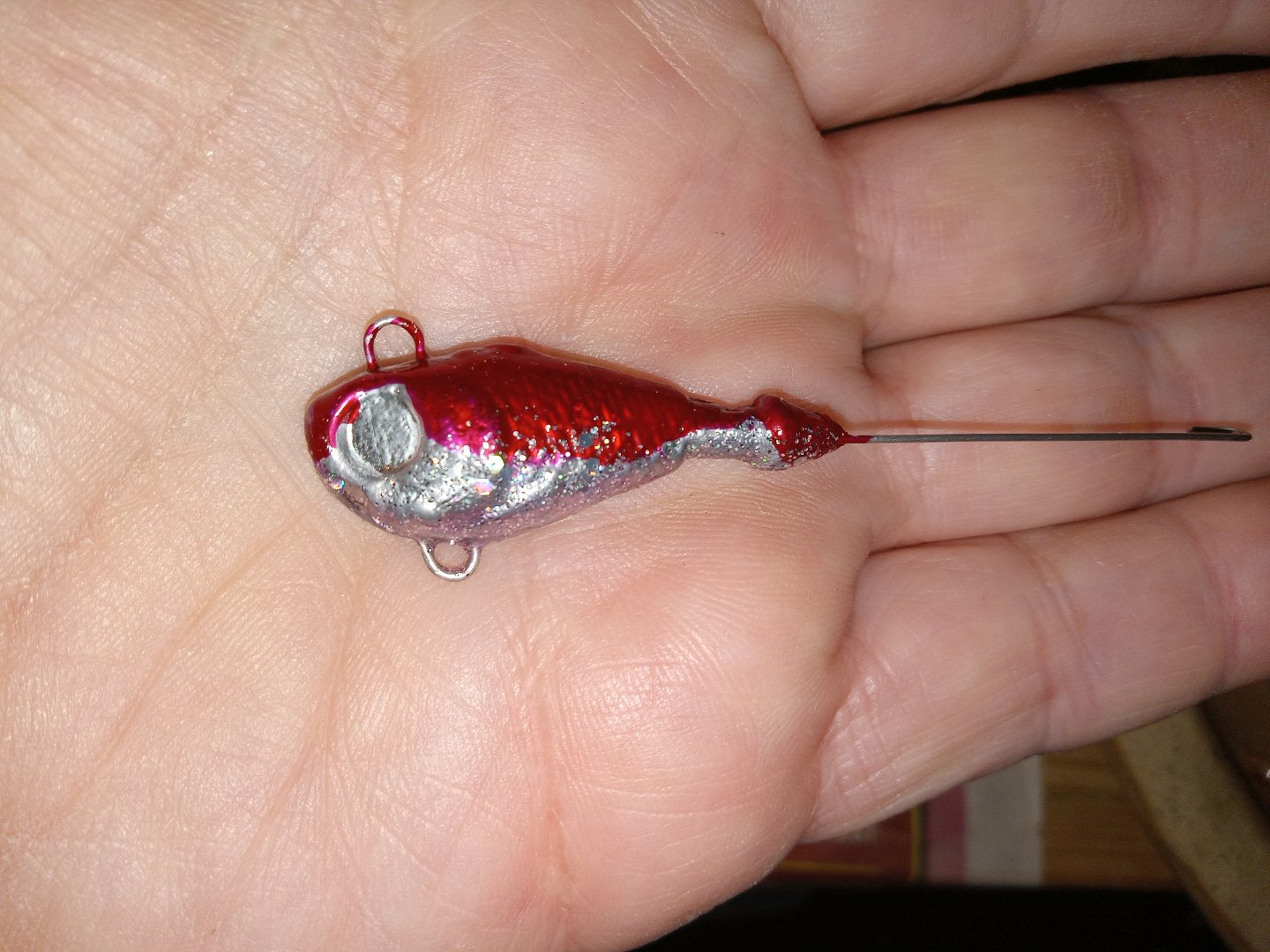 Made a wire form with loops for the top and bottom of the jighead, and a long tail that would stick out the back where the hook would exit the cavity. Put it in the mold...gave it a squeeze to . make a light indentation. Hogged out along the indentation with a 1/16 engraving ball (5 bucks at Home Depot) to get this: