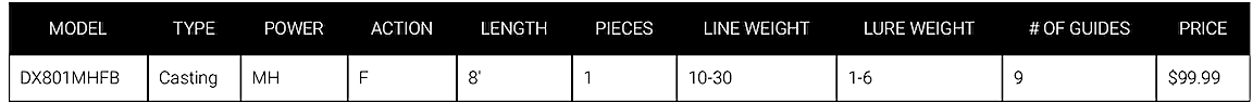 The Daiwa DX Swimbait Casting Rods are the new extreme swimbaits rods from Daiwa. Daiwa listened to pros and anglers alike and tried to incorporate all the features they wanted in their go-to swimbait rods. Perfect for big swimbaits and even umbrella rigs, they have the beefy backbones you need to get the hook into big fish with a big bait, especially at the end of a long cast. Each rod measures in at 8ft in length for maximum leverage and line clearing capabilites, and the super sensitive IM7 graphite blanks also allow you to toss swimbaits a mile with pinpoint accuracy and feel everything your bait comes into contact with. Premium Fuji Aluminum Oxide Guides deliver the strength and durability to stand up to casting big baits and fighting big fish, and premium Fuji Reel Seats also provide a sturdy ergonomic base for your reel.