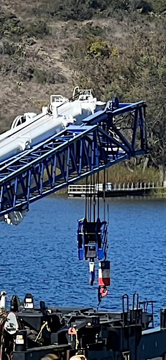 When I arrived it was pretty shocking as the launch ramp was filled up with huge pipes and a big barge was just outside of the ramp with all types of equipment on it. Across the lake was another big barge and another area out towards the dam that was marked off with orange floating buoys. I walked around a big fenced area to see all types of huge pipes and connectors and other equipment. I was told in September that the project was going to shut down all on the water activities and fishing but never thought just how big of a project this was.