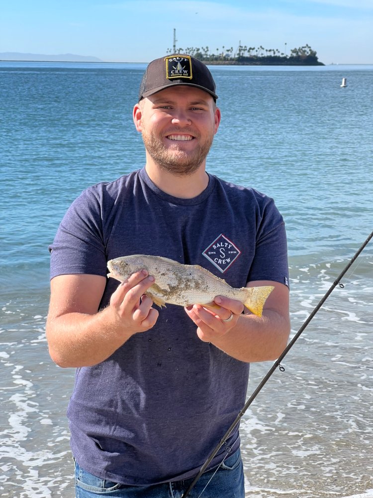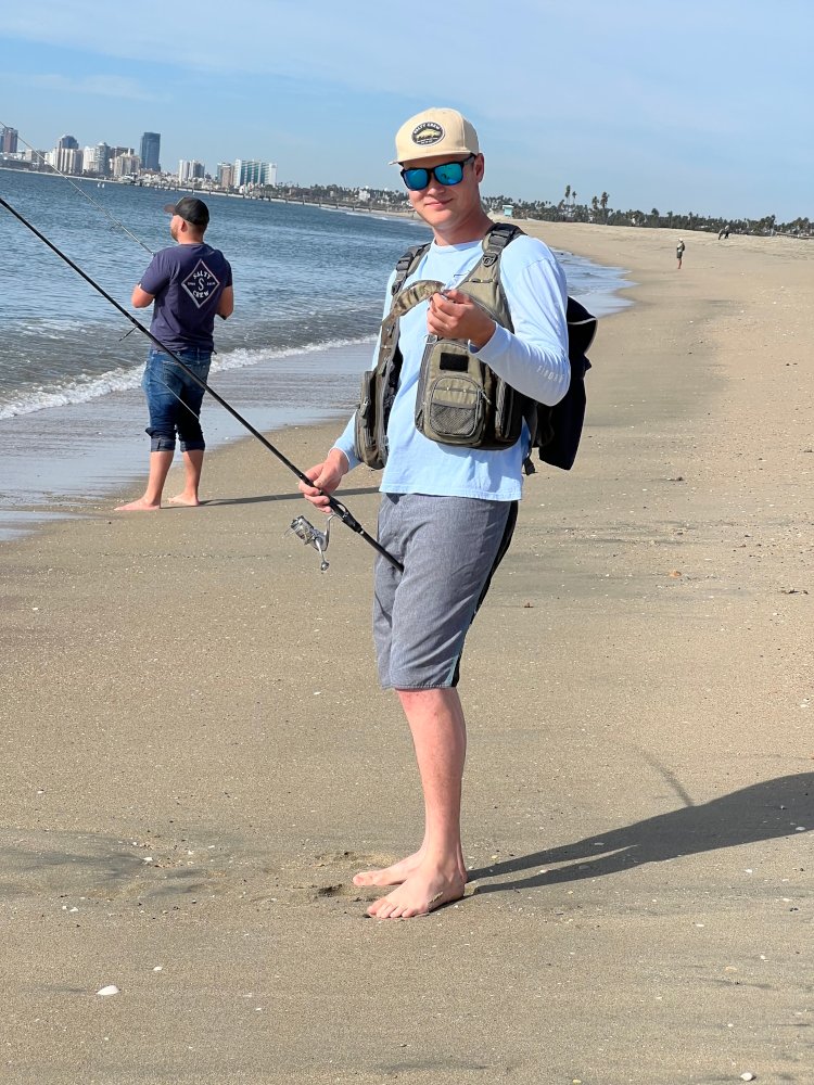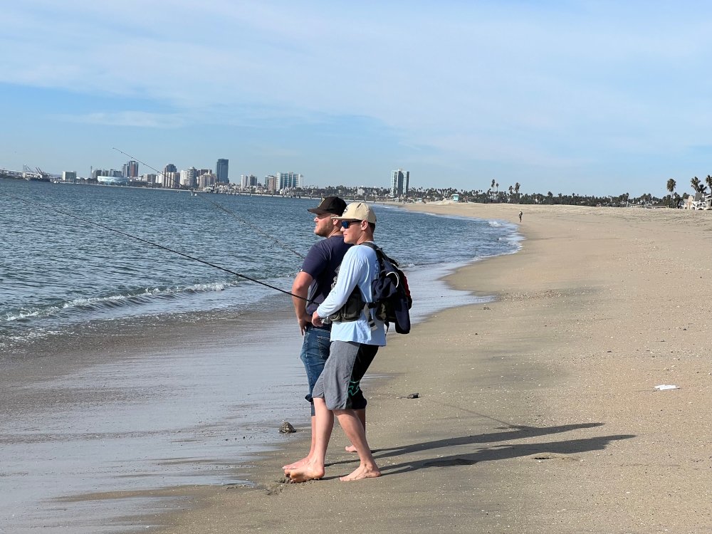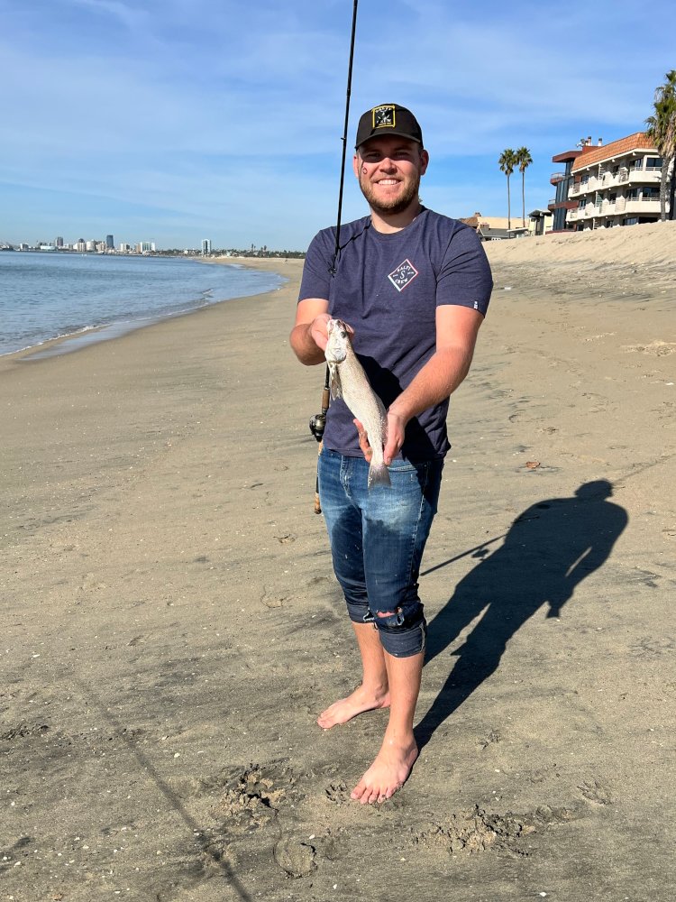 Grandson called me Friday night and asked If I'd like to do a little surf fishing with him and his buddy... His buddy is a fisherman but hadn't surf fished since he was younger... My Grandson supplied all of the gear for him to use... We decided on fishing the inside and outside of Alamitos Peninsula (Long Beach)... Inside I got 2-large jack smelt, and Grandson's friend 1-jack smelt... Wanting to catch something other than smelt we hopped over to the open ocean side... There the friend had the hot stick, he caught 3- medium to small corbins, 1-YFC and a dink sand bass... My Grandson finally broke the skunk with a small sand bass as well... I wrapped it up with a 18" halibut... The some what newbie out fished us old hands... Fun time fishing with my Grandson and meeting his buddy... Most of the fish were caught on blood worms, while the smelt seemed to prefer ghost shrimp...