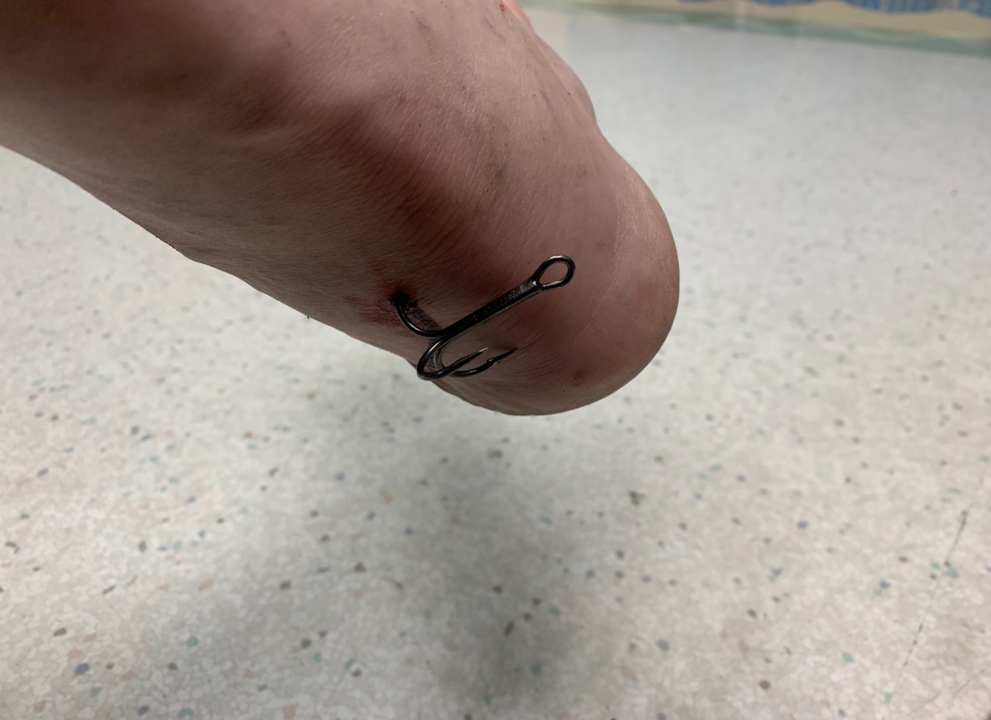 The hook went through my finger with just the tip of the point coming out the other side of my finger.