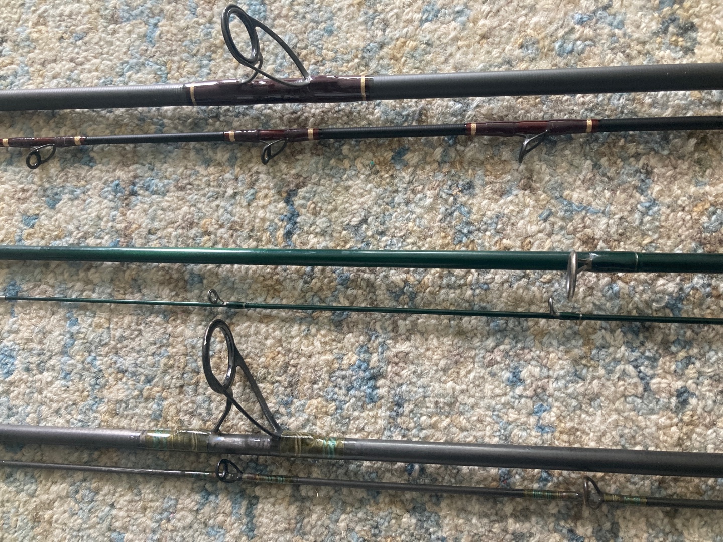 I have (3) custom surf rods for sale. Will make a great deal if you want to take all three. The rods are all steelhead rod with a lot of glass, so they have very soft tips. They are all in great shape, the NFC rod is a brand new build. Great sticks to fish the surf with artificials or bait. All 2-pc rods.