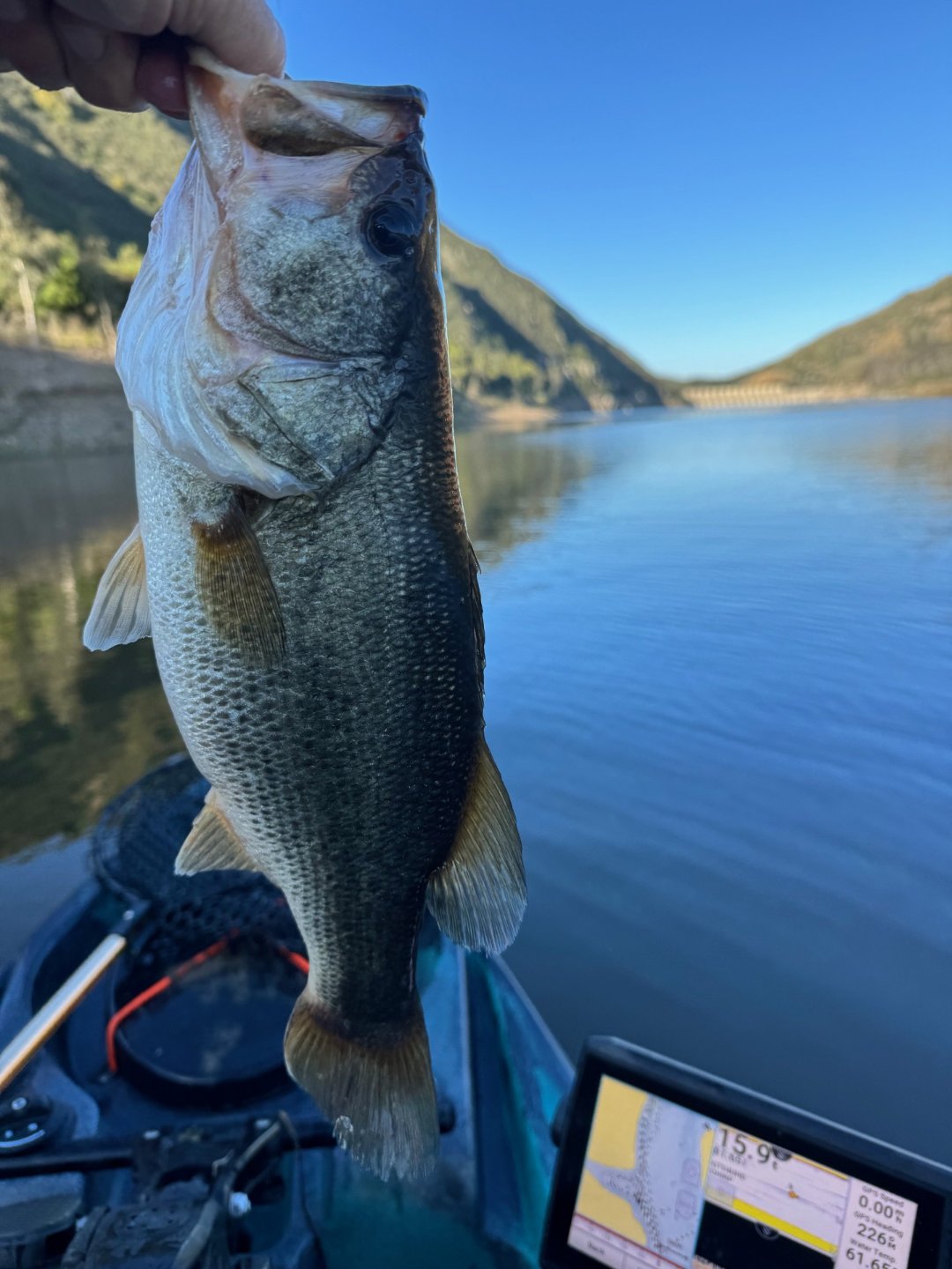 Got out bright and earlyish to Hodges. Something like 0630. No wind at all and water temp was 62F. Also no blanket of fog on the water, so you could see pretty well. Kind of made me miss the fog. Water was warm enough for me to poke around with the popper, and follow with the spinnerbait and then a 1.5 squarebill. Fruitless. Saw a bunch of tiny shad again, I took a photo of them last week, see below. This convinced me that a crappie jig with an underspin, a #7 Rapala and a little shad crankbait were the go to baits. For the rest of the day that was what I mostly used. Underspin got one. #7 Rapala got one. Shad crank got 9. Today's group was better than last week. Most of them were around 2 pounds, only one sample size fish today, the big one of the day was 3 pounds 8 ounces. I think that one might have been a better fish a couple weeks ago. She was kind of thinner. Fought like a tuna though, I thought that she was a 5 pounder until I got her in the kayak. Off the water at 1100, water creeped up to 65 F. That lake warms up quickly.
