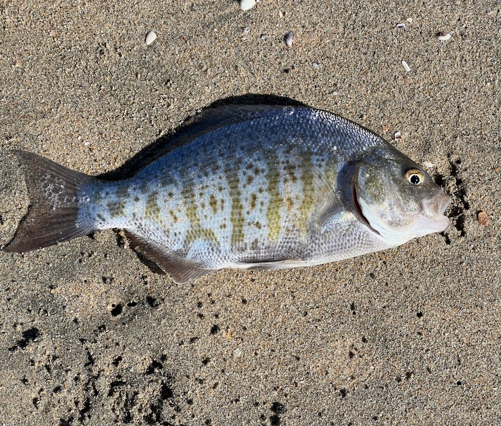 Conditions were great with small surf, beautiful sky and clear water... I started out using dried blood worms for 3 dink BSP, but over all slow fishing... I met a couple of buddies down there, and they were doing about the same as me... Except for one of the guys that had scrounged some sand crabs from out deeper in the wash... He pulled in 3- corbs, and 10- slab perch... He gave me a few of the crabs and 1st cast a 12-13' BSP... But none with the rest of the crabs, all stolen by fish , with no hook ups... The sand crabs were the ticket...