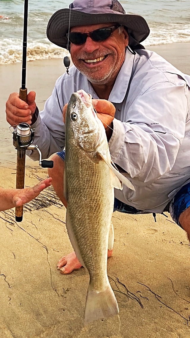 I mostly use an 8 1/2 foot rod with a 1000-2500 size reel and 6 pound test mono with 8 pound Flourocarbon leader. The light line doesn’t get washed around as much and is less blown around by the wind. Most of our fish are eating Sand Crabs so I don’t cast out far. We rarely use more than a 1/2 ounce egg sinker. I never use a rod holder except to re-rig.