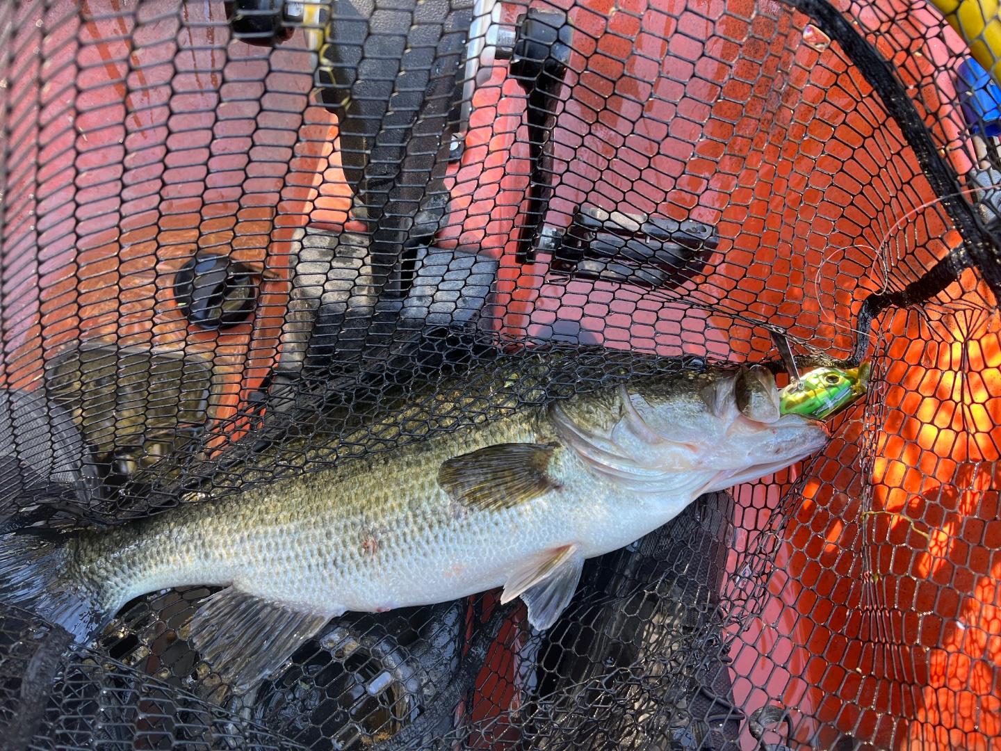 First in line, got on the water with Dave @4:30, it was cold and foggy. Headed to Hauser, didn’t find fish till sunrise, fog and cold had something to do with it. Started to get them on popper, few blow up on frog,the crawler seemed to get the quality fish. Much slower than last week, ended up @20+ a nice 4.7 on a crawler, 3s and 2s in the mixed. Left @1 water temp @72