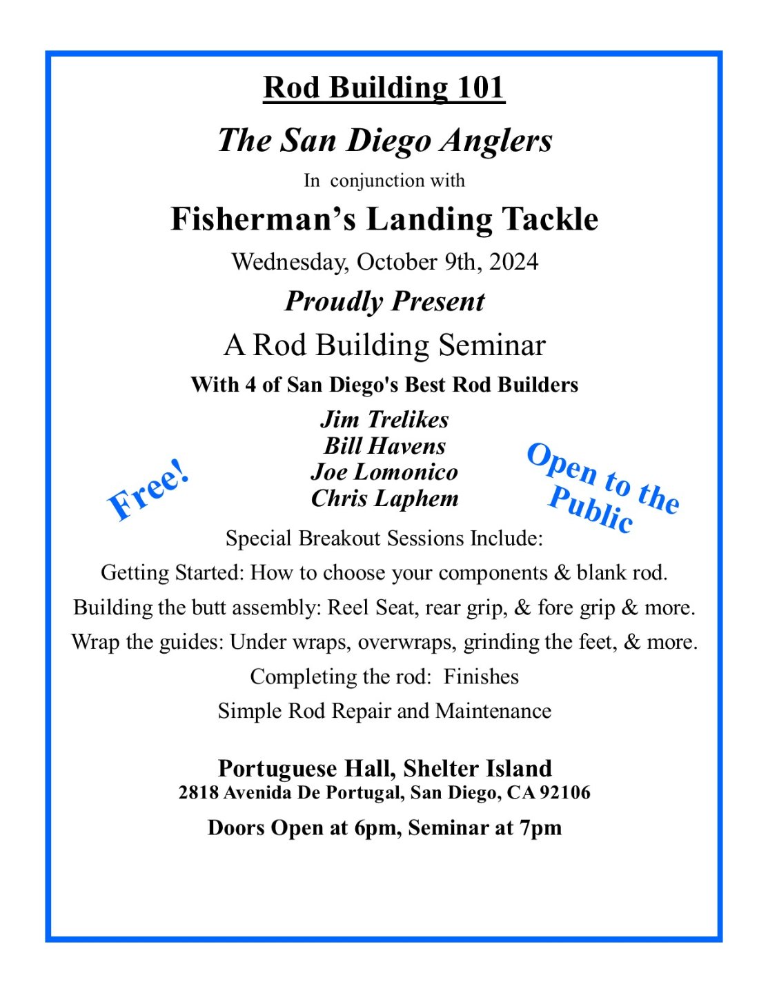 San Diego Anglers in partnership with Fisherman's Landing Tackle are hosting a free rod building event that is open to the public. It this Wednesday October 9, 2024 at Portuguese Hall, Shelter Island. 2818 Avenida De Portugal, San Diego, CA 92106. Doors open at 6 pm with seminar starting at 7 pm. Attached is a flyer with more information.