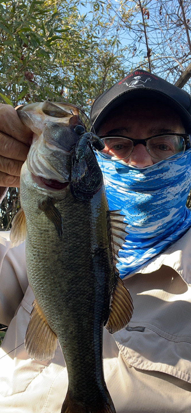 Decided to skip a trip to Murray and headed out to the SD river. Got there around 7:30 and there was even more surface area covered with a green film than last week. I imagine that with some good winter rains it will be able to flush out a lot of this yucky green water. On the positive side, after a few casts, it made my green braid line ever greener...ha ha Started off with a crank bait and later switched over to an underspin. Not much later, I decided to start flippin' as that is one thing that I have had my most success with the last number of years at the river. Started working a brushhog and I flipped it into some sunken branches and suddenly the line was heading out away from the shore.The bass in the SD river really fight hard and when I set the hook, I knew I had a nice bass because it started taking out drag and I set my drag pretty tight. The fight was on as it started digging in and it came out of the water 2 times and I just was hoping so much it would not come off. I finally landed it and being very jazzed is an understatement.