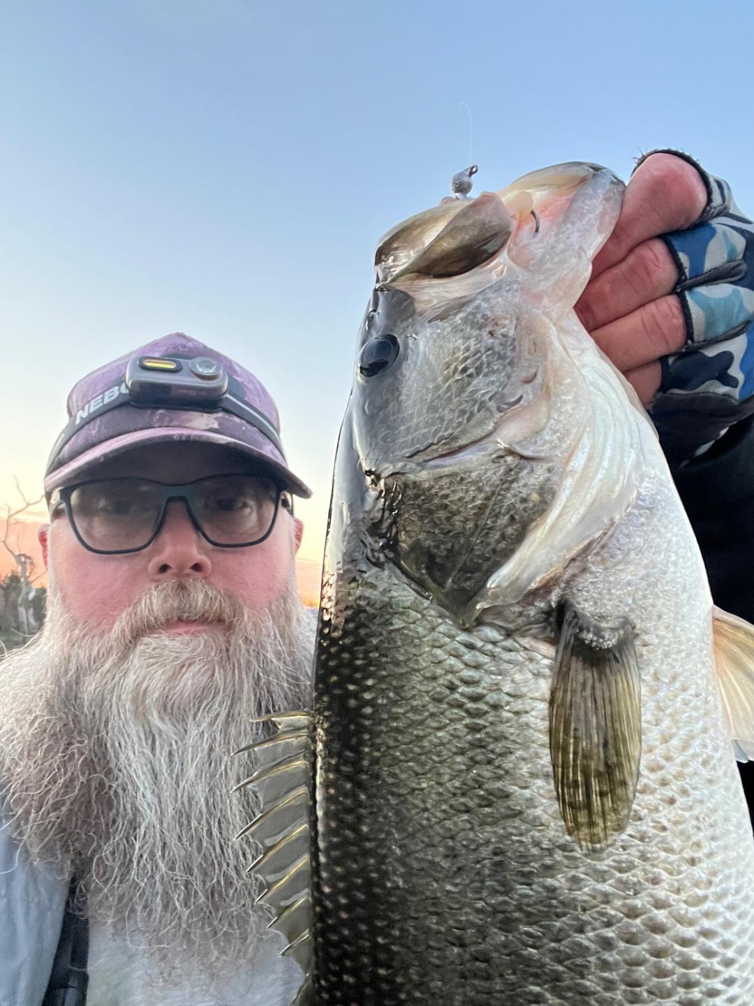Got in the water well before sunrise and was greeted by some busters and an early catch on a small subsurface walking bait. Threw a 110 Jr for awhile and almost every cast came back with a nice sized shad attached to it. That kept the birds around me fed for a bit.. LOL