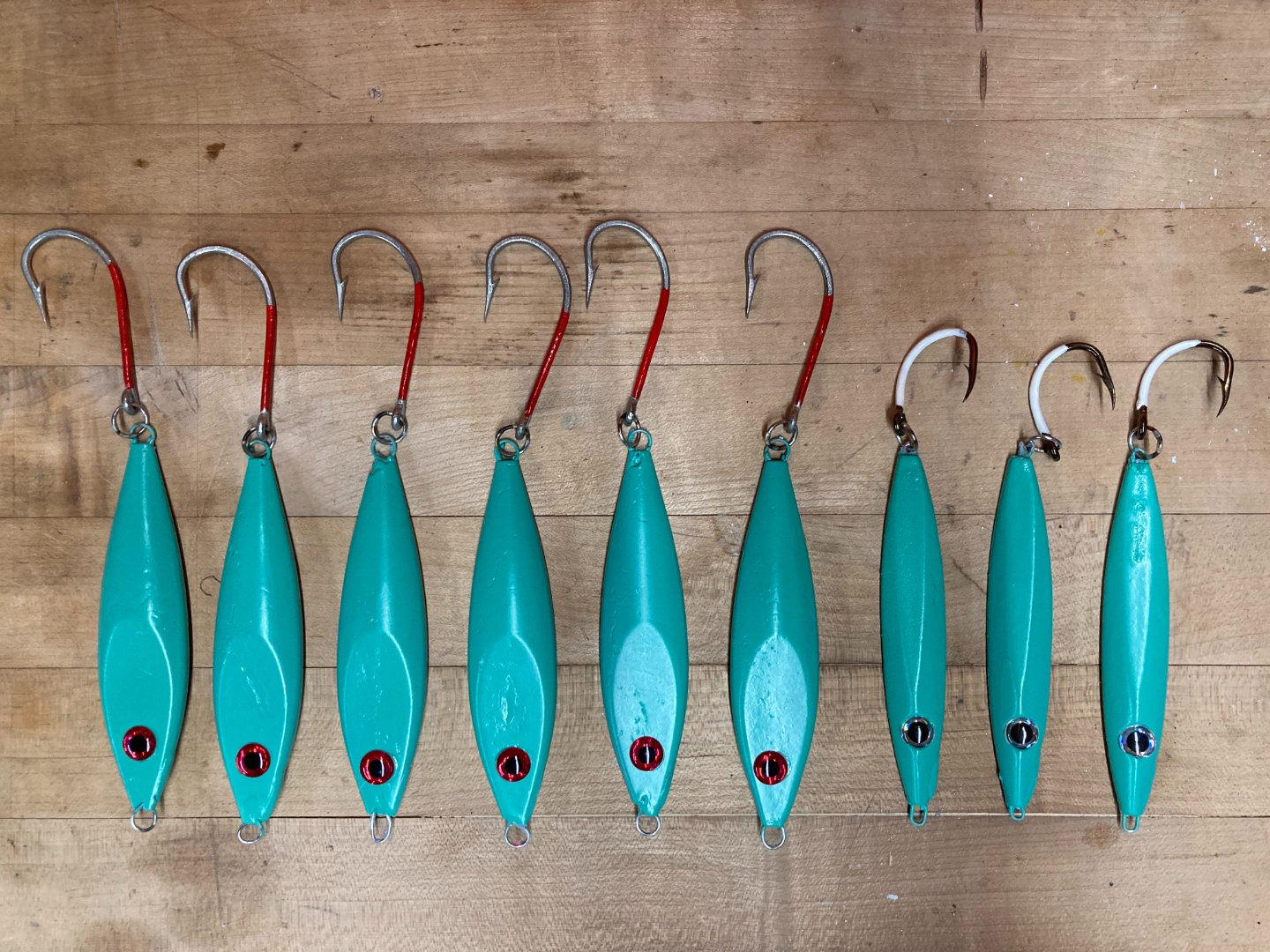 Lot 1: $40 - (3) 90g and (6) 170g jigs with brazed hooks and stainless through wires