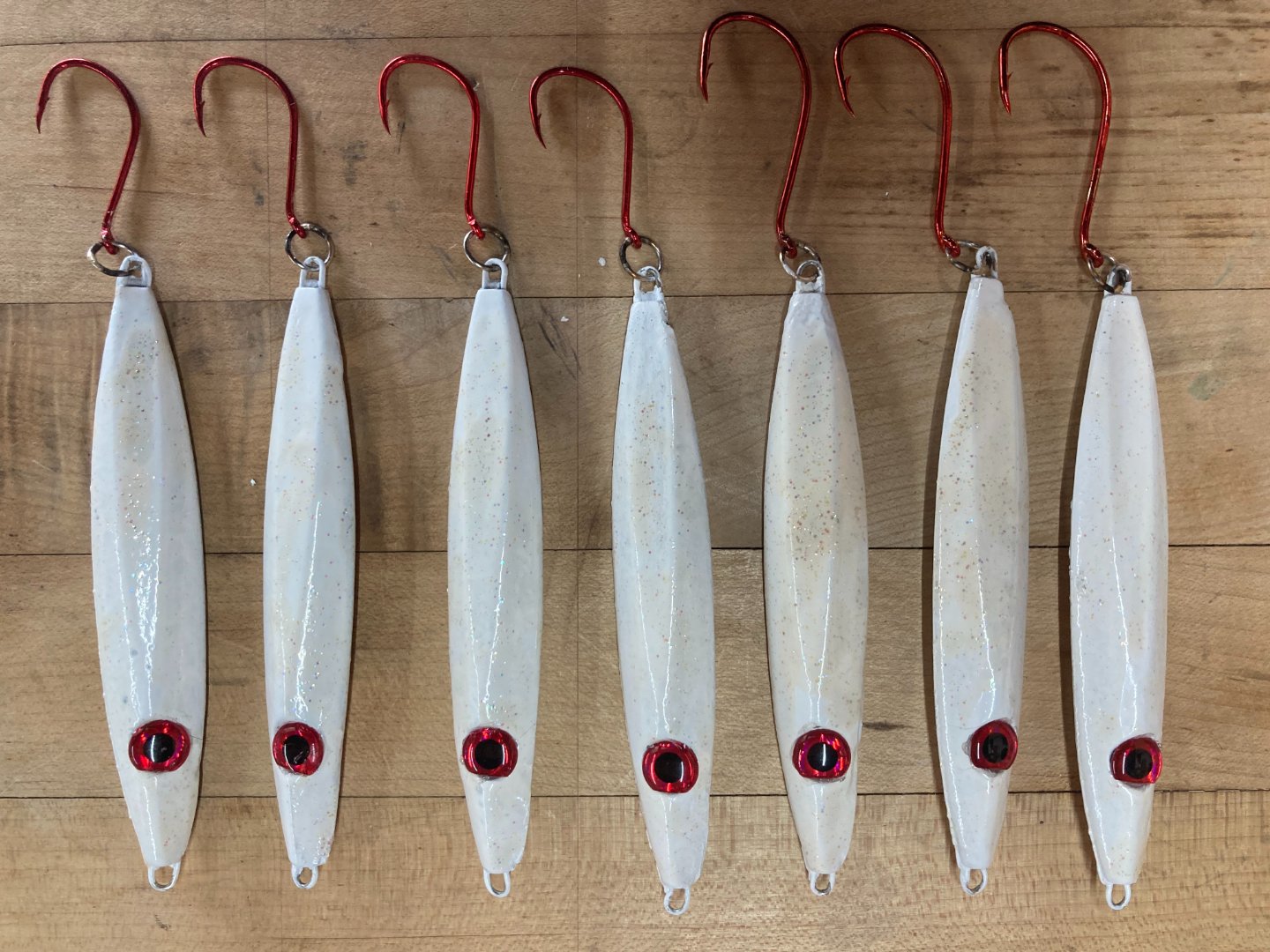 Lot 2: $30 - (7) 90g white jigs with brazed hooks and stainless through wires