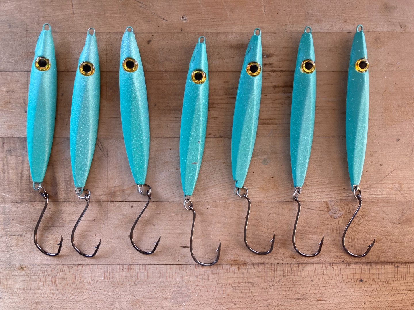 Lot 3: $30 - (7) 90g mint jigs with brazed hooks and stainless through wires